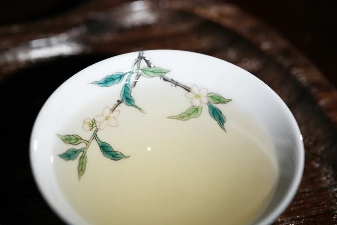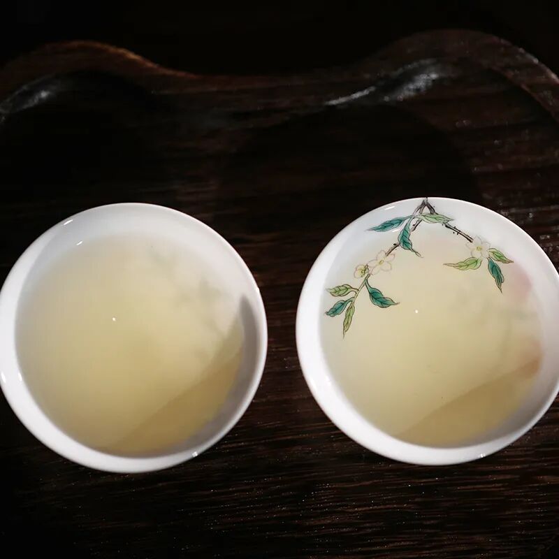 传承粉彩工艺技法,其中一只采用过枝画法,让对杯不单是两只杯子相若,而是多了一分变化,多了一抹雅趣。过枝画法,即图案自外壁攀延过口沿,伸展铺陈于内壁,使器物内外图案既独立成章又浑然一体。