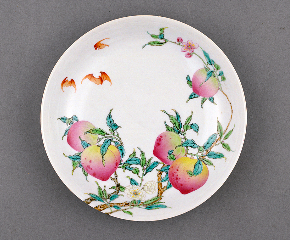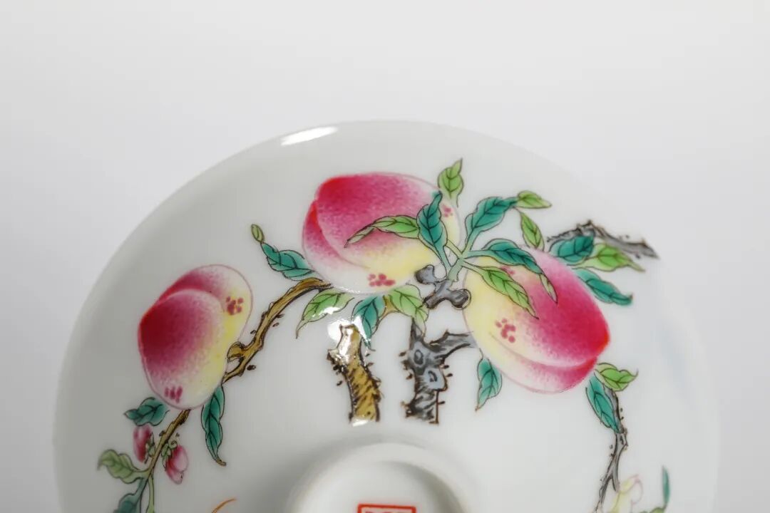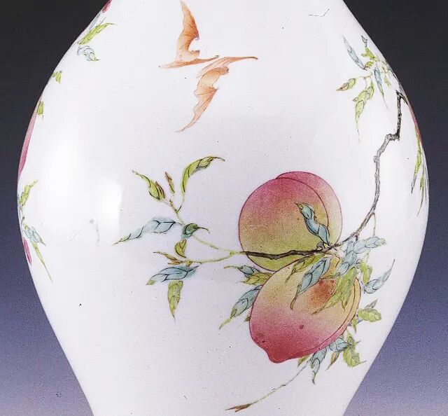 白净的外壁以粉彩绘桃枝一双,遒劲盘亘,有力地向四周伸张。枝上绘寿桃八只,圆润饱满,色彩过渡自然。桃叶施绿彩,正反阴阳,一浅一深,节奏鲜明。桃枝之间绘一对飞舞的蝙蝠。这种将蝙蝠与寿桃相结合的吉祥图案,在清代极为流行,正是福寿双全之寓意。