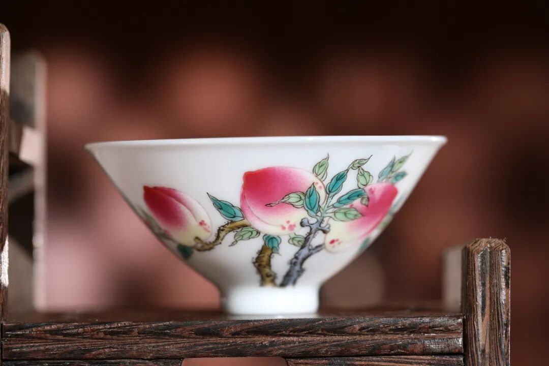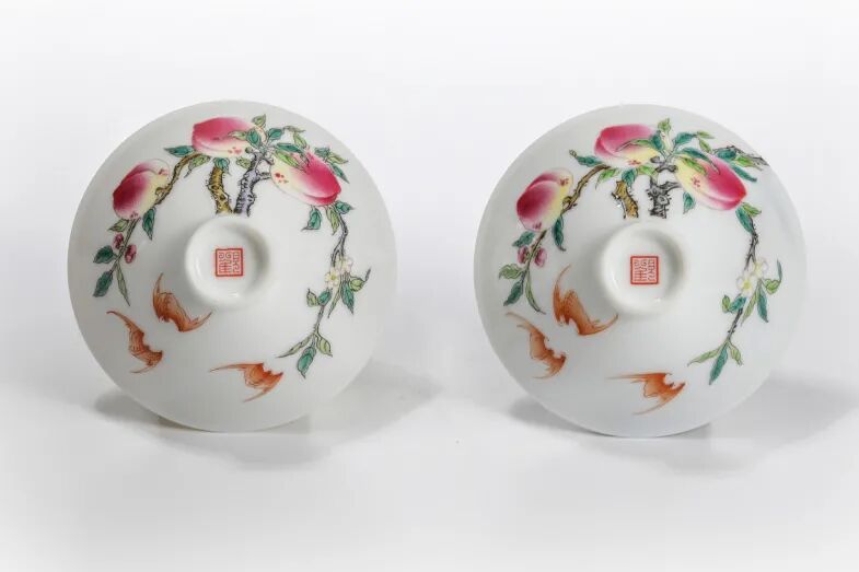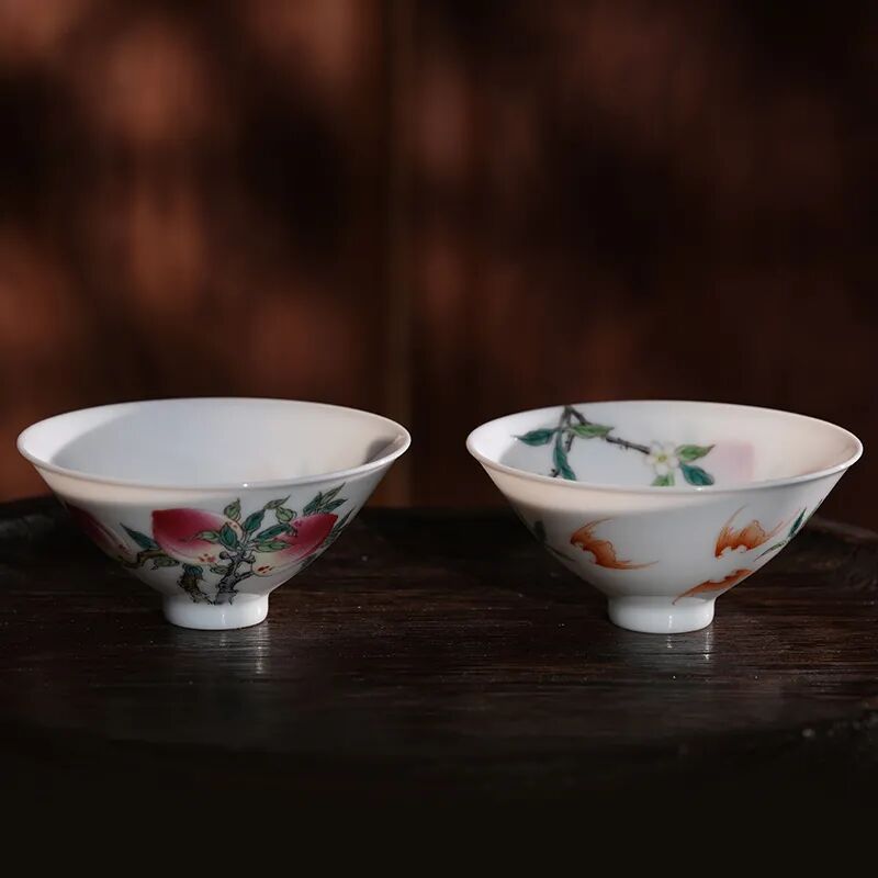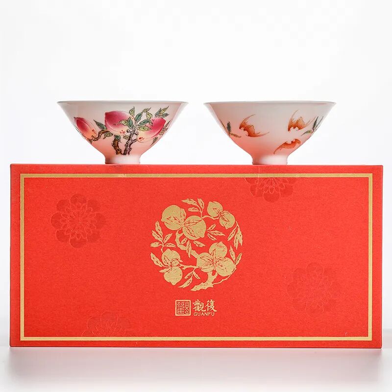 观复文化秉承“与古人对话,与文化同行”的理念,撷取上海博物馆及故宫博物院收藏的多件蝠桃纹粉彩瓷器为创制灵感,推出观复粉彩福寿双全对杯▼