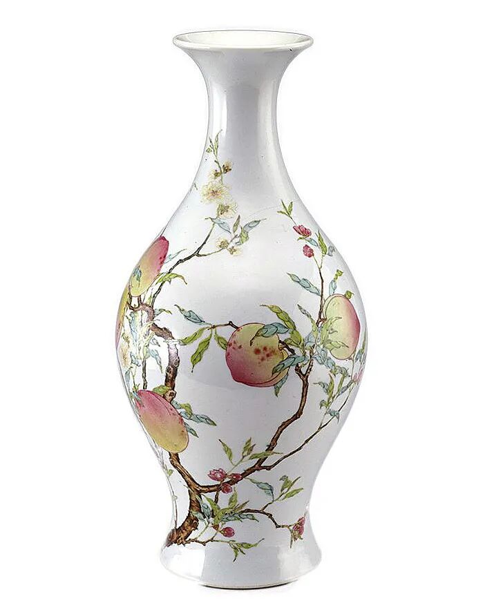 这类蝠桃纹橄榄瓶,流传至今的传世品极为稀少,粉彩的,目前全世界仅见此一件,弥足珍贵。另外故宫博物院和上海博物馆共有三件青花的。