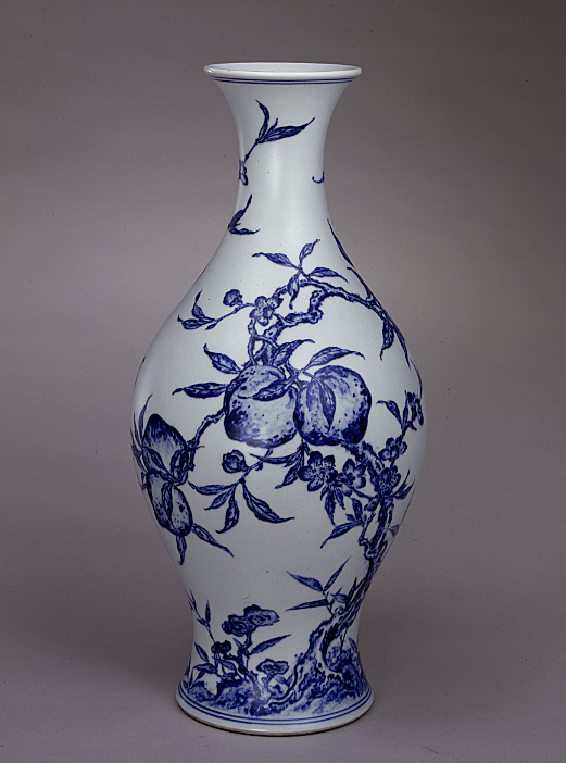 上海博物馆同时还藏有一件清雍正青花福寿双全八桃纹橄榄瓶。一件粉彩,一件青花,可谓福寿双全,全上加全。