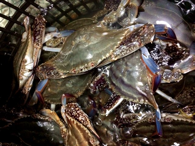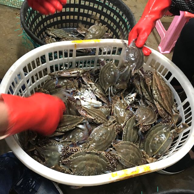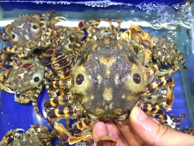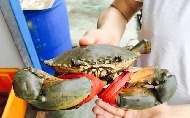 这是蝤蛑,上海人叫青蟹。台湾人叫“蟳”,或“红蟳”。主要栖息于东海的海岸线边缘,穴居于海滩边沿的泥涂中。其大者如升,小者如盏碟,两螯无毛。八月的大蝤蛑,力大无比,可与虎斗。是为资深补品。《本草纲目》:“其扁而最大,后足阔者,名蝤蛑。南人谓之拨棹子,以其后脚如棹也。一名蟳,随潮退壳,一退一长。其大者如升,小者如盏碟,两螯如手,所以异于众蟹也。其力至强,八月能与虎斗,虎不及也。”看,这只大蝤蛑超过2斤啦!够大够沉够威猛。价格不菲哦。每斤售价超过120元了。