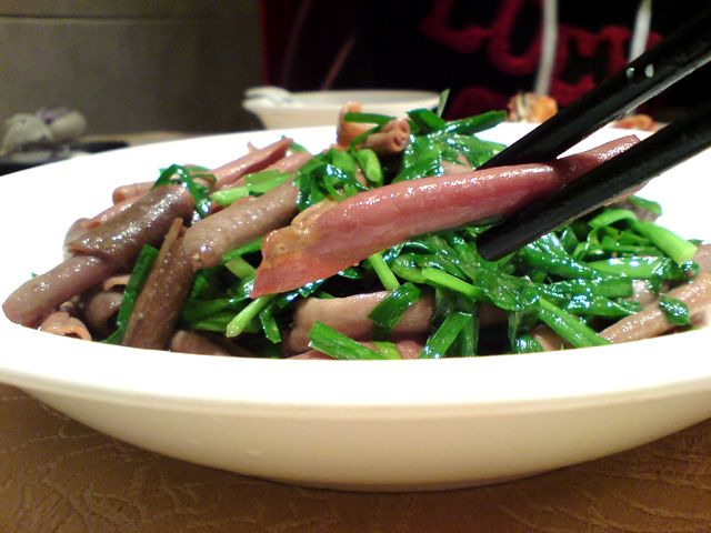 据传海肠有催情的功效,当然不仅仅是因为“以形补形”,而是因为它含有人体所需的 V E等多种微量元素。海肠与韭菜同炒,不仅味道鲜美,更有温补肝肾、壮阳固精的作用。
