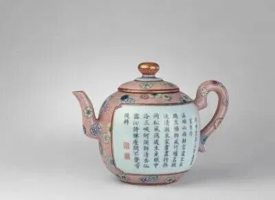 清代瓷器茶壶上除了艳丽的纹饰还有诗文作为点缀,突出了文人气息,彰显文人情趣,这是清代之前很少见的装饰风格。