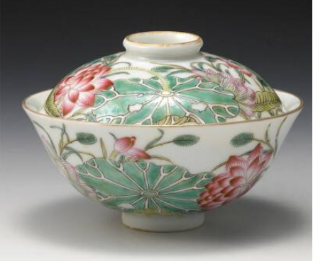 清时的茶盏,康熙、雍正、乾隆时盛行的盖碗,最负盛名。盖碗由盖、碗、托三部分组成。盖呈碟形,有高圈足作提手;碗大口小底,有低圈足;托为中心下陷的一个浅盘,其下陷部位正好与碗底相吻。