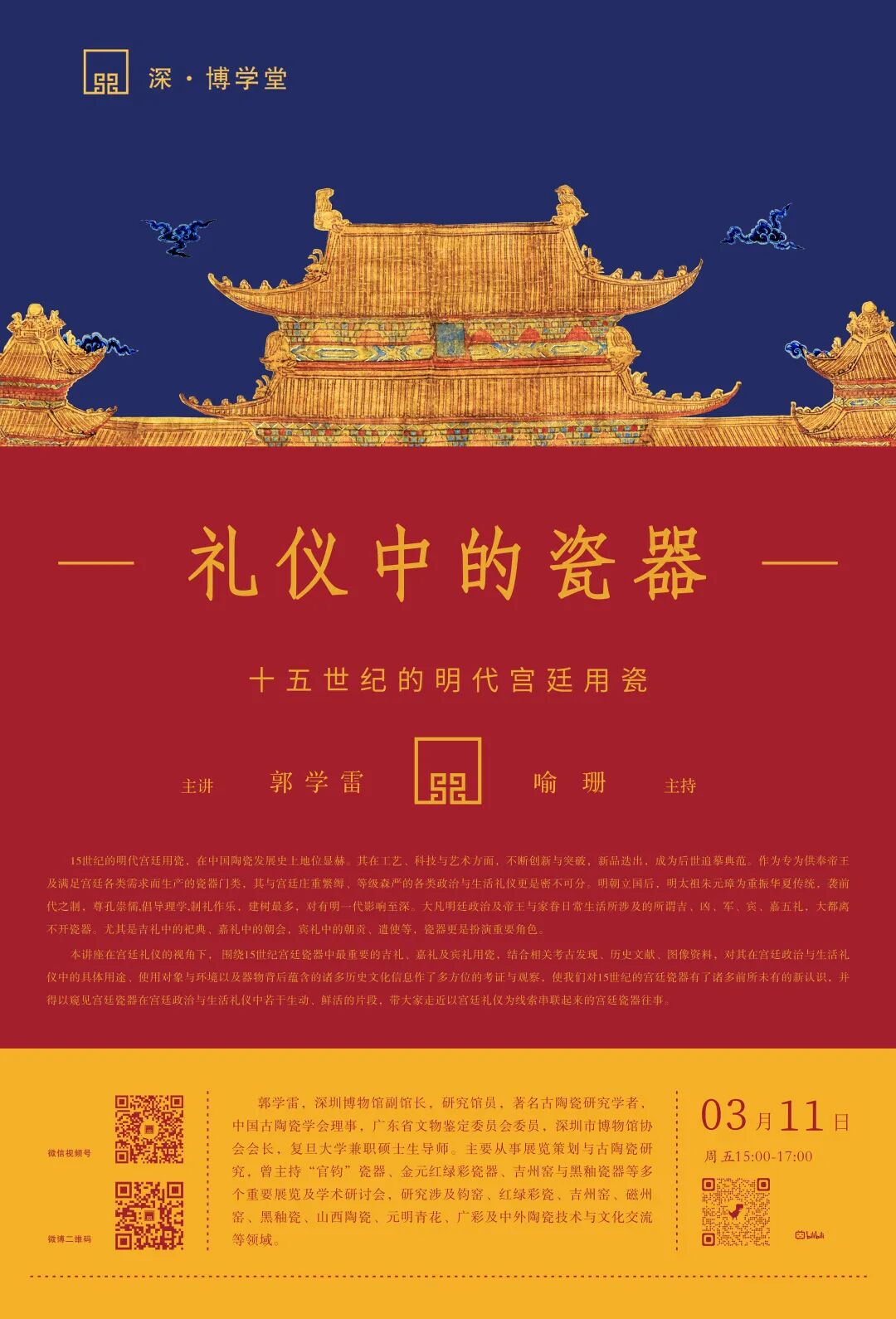 本讲座在宫廷礼仪的视角下, 围绕十五世纪宫廷瓷器中最重要的吉礼、嘉礼及宾礼用瓷,结合相关考古发现、历史文献、图像资料,对其在宫廷政治与生活礼仪中的具体用途、使用对象与环境以及器物背后蕴含的诸多历史文化信息作了多方位的考证与观察,使我们对十五世纪的宫廷瓷器有了诸多前所未有的新认识,并得以窥见宫廷瓷器在宫廷政治与生活礼仪中若干生动、鲜活的片段,带大家走近以宫廷礼仪为线索串联起来的宫廷瓷器往事。