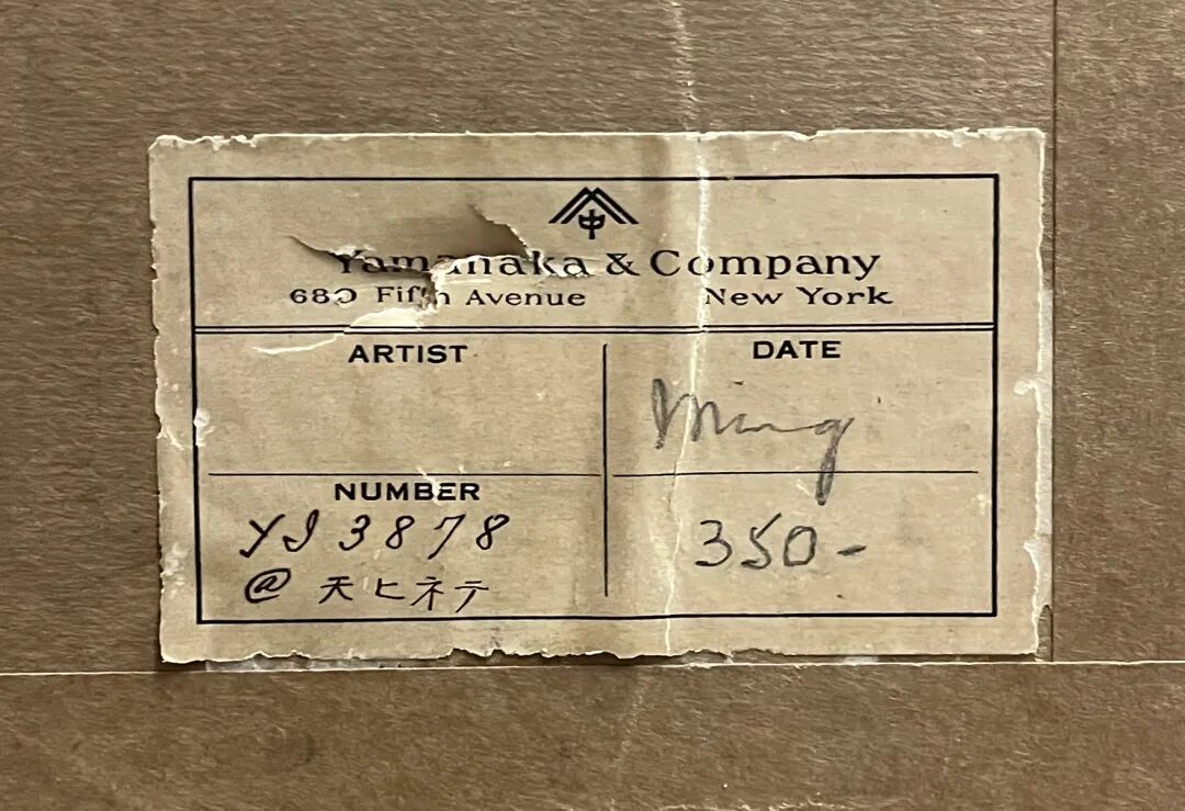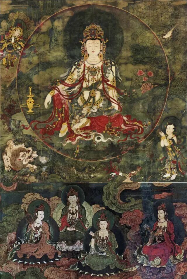 来源:来自俄勒冈州 Taylor 先生,40年前购于纽约,画框背面有山中商会标签。水陆画起源于三国时期,自金代至元、明、清时期盛行的佛教寺院为超度亡灵,普济水陆一切鬼神而举行的一种重要佛事,是「三教合一」大背景下产生与发展的民俗文化现象。水陆画是水陆法会上供奉的宗教人物画。水陆画题材主要取自儒、释、道三大教,线描空化丰富,人物造型优美,画面色彩丰富和谐。水陆法会是指开设法会时救度者与被救度者集会于一堂,凡与会者都能得到超度施法与施食同时进行,普度受苦众生,是一种设斋供奉佛神以追荐超度亡灵众鬼的大法会,是中国宗教活动中场面隆重、规模盛大、所需时间较长的一种仪式。水陆画是随着水陆法会的产生而出现,是寺院或私人举行水陆法会时悬挂的宗教画,是举办水陆法会不可缺少的圣物之一。元明之时,水陆道场悬挂的水陆画基本定型,一般寺院修设的大西水陆法会中一堂水陆画为一百二十幅。朝廷修设的水陆法会用到的水陆画多达二百余轴。这些作品内容包揽了民间崇信的所有神祇,它的悬挂幅数依法事规模而定,另外在这一时期除了成套的卷轴水陆画像外,佛寺道观中出现了专门的水陆殿,绘有构图结文完整的水陆壁画。画面中间端坐的是持扇观音菩萨,观音头戴宝冠,冠上有阿弥陀佛像,手持长扇,扇面绘以海屋添寿,坐于莲花座上。右侧是地藏菩萨,左手持钵,右手持说法印。画面右上方是五方佛,下方左侧是善财童子童女,手持珍宝供奉于座下,右边是金犼。菩萨衣饰线条流畅,身上首饰都以金粉描绘,精美绝伦。将地藏与观音二菩萨表现在同一画面,或处于相对应位置的做法,在唐五代北宋时期的石窟塑像与敦煌壁画、纸绢绘画中非常流行,数量极大,几乎可以列为这一时期中被塑画最多的图像类型,法国吉美博物馆就有类似馆藏作品。虽然地藏菩萨与观音菩萨形成组合没有明确的经典依据,但是在二菩萨的图像中,观音菩萨往往象征现世拯救,地藏菩萨则象征地狱拯救,二菩萨图像结合起来,类似于分工合作,满足众生不堕地狱、现世救苦的双重愿望。此画作于明代,可参阅法海寺壁画,水月观音像及四菩萨像 (fig. 1),其纹饰及面相,画风装饰几乎一致。法海寺 ( Dharma-samudra Vihāra)位于北京石景山区模式口翠微山南麓,始建于明朝正统四年1439(1440年),动用木匠、石匠、瓦匠、漆匠、画士等多人,历时近5年,至正统八年才建成。法海寺占地面积20000平方米。1988年公布为全国重点文物保护单位。另大英博物馆有幅明代清凉寺壁画 (fig. 2),观音菩萨也是头戴宝冠,冠上上有阿弥陀佛像,两者画工极其相似,为同一时期产物。