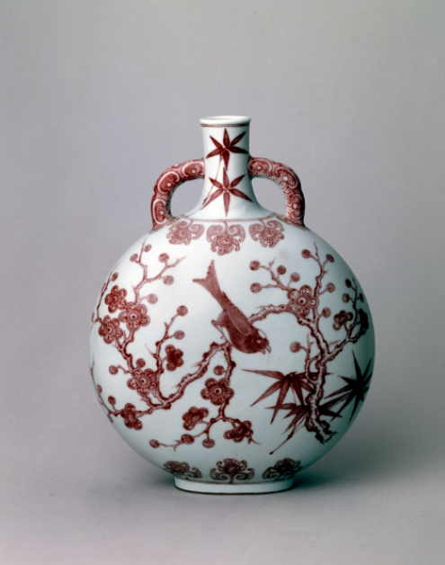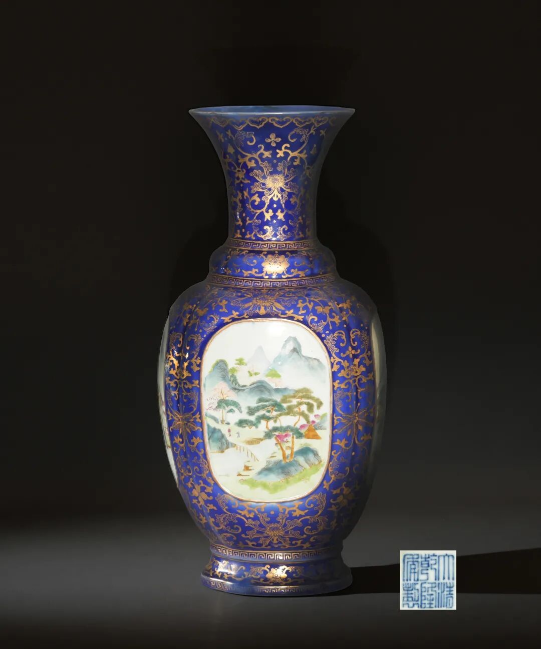 参阅北京故宫博物院馆藏,编号故00186157 (fig. 1);另见香港佳士得2021年5月拍卖,编号2951。Lot 146 清乾隆 霁蓝描金开光山水图海棠口瓶来源:来自马里兰州私人收藏,藏家于50多年前购于华盛顿特区当地拍卖行。乾隆皇帝嗜古成癖,对瓷器情有独钟,再加之督陶官唐英对御窑场的苦心经营,一大批能工巧匠汇集于景德镇,精益求精,不计成本,使御窑场的瓷器到达了前所未有的境界,各种精品层出不穷,鬼斧神工。此瓶造型特殊,工艺覆杂,瓶身倭角成海棠口形,撇口、长颈、长腹,海棠口形圈足。整身施霁蓝釉,器身霁蓝釉描金缠枝莲纹,口沿整圈绘以如意纹,颈身和瓶身及圈足以描金回纹相连,金彩靓丽夺目,与霁蓝釉相得益彰,整体凸显器物本身之富丽华贵。瓶身四面开框留白描金,并绘以四幅不同的山水图。以山中一景的各个角度绘以亭台楼阁,小桥流水,把整体串联在一起,使景物灵动,充满故事性,使富丽堂皇和唯美意境完美的融合在了一起,显示出此瓶创作时的水平之高,意境之美,凸显出当时乾隆皇帝对瓷器审美要求之高。底款为大清乾隆年制六字青花篆书款。相同作品见录于《钓鱼台国宾馆美术集锦》一书(小学馆,页151,图版169),故宫也有类似藏品,可参见《故宫博物院藏文物珍品大系—珐琅彩·粉彩》图131,清乾隆霁蓝描金开光花鸟图八方瓶,与之相比,本品有过之而无不及。参阅北京故宫博物馆藏霁蓝釉描金地开光粉彩花鸟纹方瓶 (fig. 1);香港苏富比拍卖2000年5月拍品编号645,保利香港拍卖2015年4月,拍品编号3412。尺寸:26 cm X 20.3 cm X 7.6 cm瓶小口,直颈,颈两边饰如意形耳,扁圆腹,椭圆形圈足。通体釉里红纹饰,颈绘竹叶纹,肩部及胫部分绘五出叶纹相对应,双耳各饰灵芝纹,画面中间梅花枝头上停著一只喜鹊,树底生矮竹几丛。画工生动细腻,釉里红发色纯正,浓淡相宜,瑰丽多姿。北京故宫博物院、香港徐氏艺术馆均珍藏有同类产品。釉里红器烧造之难,人们常用「十窑九不成」和「百里挑一」来形容,因而其珍品往往价值连城。过去只有御窑厂才能不惜工本地反复烧制,是真正属于皇帝的限量款。乾隆皇帝曾十分关注釉里红器物的烧造,如乾隆三年《清宫内务府造办处活计清档·记事》记录,十月二十九日太监毛团、胡世杰、高玉传旨:“釉里红龙梅瓶红龙颜色不好,往好里烧造……”。乾隆四年又谕旨釉里红颜色务要“花纹清真,釉水肥润,颜色鲜明”(参见《唐英奏折》第六十二号)。喜欢程度可见一斑。抱月瓶在清朝初期重新受到了青睐,以唐英为首的清代宫廷工匠们也开始重塑经典。在其指导下,各类仿古的瓷器在工艺及造型上得到了极高的还原。众所周知,雍正皇帝曾多次将北京皇家收藏的古董瓷器送到景德镇覆制。特别是乾隆时期,宫廷模仿前朝作品更为盛行,本件釉里红作品与大英博物馆藏明代永乐青花抱月瓶(编号- PDF,A.612)纹饰及器型几乎一样。明代永乐官窑落款甚少,乾隆帝为向经典致敬,器物经常不落年代款识。本件抱月瓶品相完整,发色一流,虽未有落款,但从其工艺来说,应是乾隆造办处出品无疑。故宫博物院也出现有一乾隆本朝釉里红抱月瓶,与本作品如出一辙。因抱月瓶器型及工艺的覆杂,现世留存极少,大多散落在各国博物馆。拍卖市场上虽有流出类似作品,但是乾隆本朝作品较少,本件作品珍贵程度可见一斑,其定能在拍卖场上大放异彩。可参阅大英博物馆藏永乐青花花鸟纹抱月瓶,编号PDF,A.612,本件作品与其基本相似。故宫博物院藏清乾隆釉里红梅竹先春纹扁壶,编号故00152289 (fig. 1)。另见苏富比伦敦2011年3月拍卖,编号303;佳士得香港2015年6月拍卖,编号3126。