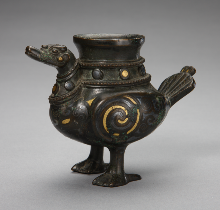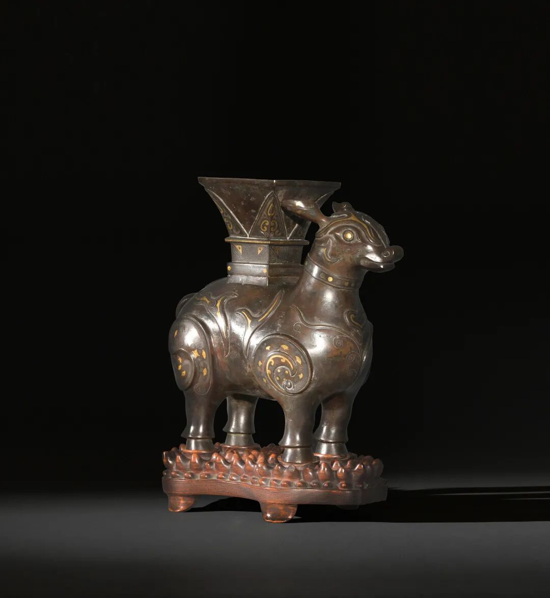 尺寸:27 cm X 28.6 cm X 12.7 cm来源:购于佳士得纽约2018年2月13日拍卖,拍品108号。来自洛杉矶古董商 JF Chen 收藏。据史料记载,我国早在上古时代人们就对貘很熟悉,并把它看成是一种神兽,《山海经》中说,此兽能食铁与铜,所以又称为食铁兽。它还能为人们吃掉噩梦,留下美梦,还人以安宁之眠。唐代大诗人白居易曾写下一篇《貘屏赞》,称:“貘著,象鼻犀目,牛尾虎足,生于南方山谷中。寝其毗辟瘟。图其形辟邪。予旧病头风,每寝息,常以小屏卫其首。”此貘鼻子弯曲,尖耳朵呈喇叭状,向上翻起,头顶部有一对错金对角,眼珠以黄金填充,霸气十足,颈部有一圈凸起,镶以金银小圆点,具有明代典型特征,四足关节处以圆形浮雕加以措金银纹饰,粗壮有力,使整件器物漂亮非凡,并配以乳钉状回纹硬木座。貘背上驮以方形尊口,尊口为撇口,以三层尊器连接下部貘身,配以金银纹饰,整体充斥着明末清初青铜器的典型特征。青铜器在当时绝非普通贵族所能拥有,此尊以青铜铸造,并且整体错金银,工艺繁琐考究,气势非凡,包浆完美,定是为当时宫廷所铸造。可参阅故宫博物院藏品错金银鸟尊,以及国立博物馆铜嵌金银天鸡尊。这两件作品均为当时宫廷精品,与本件作品在铸造工艺及纹饰等方面都有异曲同工之妙。此件作品流传至今,保存的如此完美实属不易,同类作品存世稀少,不可多得,是一件值得收藏的精品。参阅北京故宫博物院馆藏明 错金银鸟尊,编号新00094189 (fig. 1);台北国立故宫博物馆馆藏清 铜嵌金银天鸡尊,编号故铜002533N000000000 (fig. 2);大英博物馆馆藏,编号1891,0617.12 (fig. 3)。另见佳士得伦敦拍卖2018年05月,明 铜错金银天鸡尊,拍品编号077;苏富比香港拍卖2014年04月,明 铜贴金银兽形带盖牺尊,拍品编号171。fig.3: The Trustees of the British Museum.