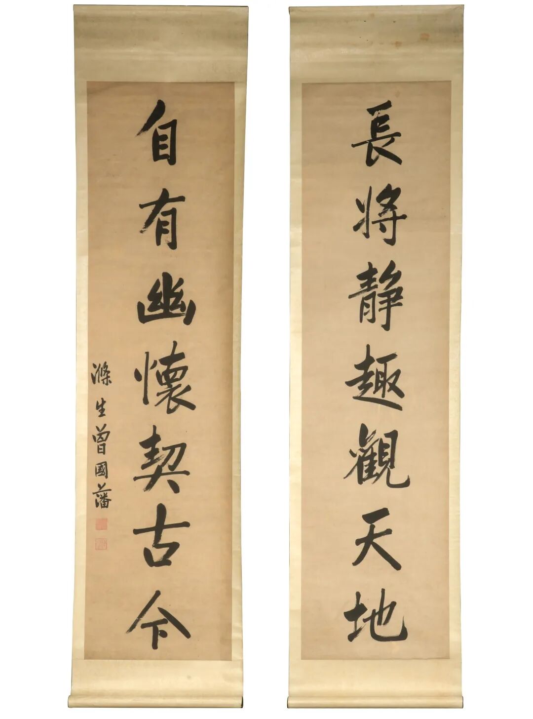 来源:来自新泽西的 Choi 夫妇,Choi 夫人是台湾著名言情小说家,笔名严沁。她自60年代起,出版过数十部言情小说,风靡中港台两岸三地,多部作品被改编为影视剧。曾国藩(1811年11月26日-1872年3月12日),初名子城,字伯涵,号涤生,晚清时期政治家、战略家、理学家、文学家、书法家,清末汉族地主武装湘军的首领。道光进士,曾任内阁学士,道光末年官至侍郎。善于讲「道德」说「仁义」,对程朱理学推崇备至。曾国藩的崛起,对清王朝的政治、军事、文化、经济等方面都产生了深远的影响。曾国藩与胡林翼并称「曾胡」,与李鸿章、左宗棠、张之洞并称「晚清中兴四大名臣」。封一等毅勇侯,谥号「文正」,后世称「曾文正」。曾氏诗词、古文成就亦高,为清代古文殿军。曾国藩的书法前人多有评述,向荣云:“文正书法初习柳诚悬,后学赵吴兴,晚年书运笔专主拔灯之法,故其书多得雄直之气。”这是曾国藩广受喜爱的名联。同治五年(1866),曾国藩以“钦差大臣”的身份到灵璧主持平叛。公事之余,他巡视书院,瞻仰乾隆帝的墨宝真迹,观赏先贤们的诗文字画,并在学道堂讲学,介绍自己处世交友之道,推荐自己修身养性之诀。临别之际,曾国藩为学道堂手书「斯文正脉」匾额一块,并题写两副对联:“长将静趣观天地;自有幽怀契古今”,“是真读书,瞒不过天聋地哑;作大学者,撇得开利锁名缰”。又在堂东,亲手栽种一棵皂角树,以寓「十年树木,百年树人」之意。「静」中见「趣」、「静」中有「天地」,静中见大、煮茶读史,皆人间最乐事。心交圣贤为快乐,行合仁义即成功。长将:经常有。静趣:清净、乐观的心情。观天地:王安石:“古人之观于天地、山川、草木、虫鱼、鸟兽,往入有得,以其求思之深而无不在也。”它的意思是说:只有在对世界万事万物的观察和体验中,才会有比较深刻的探究与思考,才会「有得」,即会有某种思想观念的产生。这是古人的养生方法或者道家的修炼之法。自有:自然会有。幽怀:豁达悠远的胸怀。契古今:契合(符合)古代和现在的人道变化。近年曾国藩的书法作品在书画市场上也广受追捧,此联对仗极为工整,命意亦佳,即藏书积学、读书习字,可称其书法成熟期中的精品,是最宜文房之品,也值得广大藏家收藏保存。可参阅台湾故宫博物院馆藏,编号购书00136900000。北京保利2021年12月秋拍,编号。北京匡时2018年12月秋拍,编号0918。