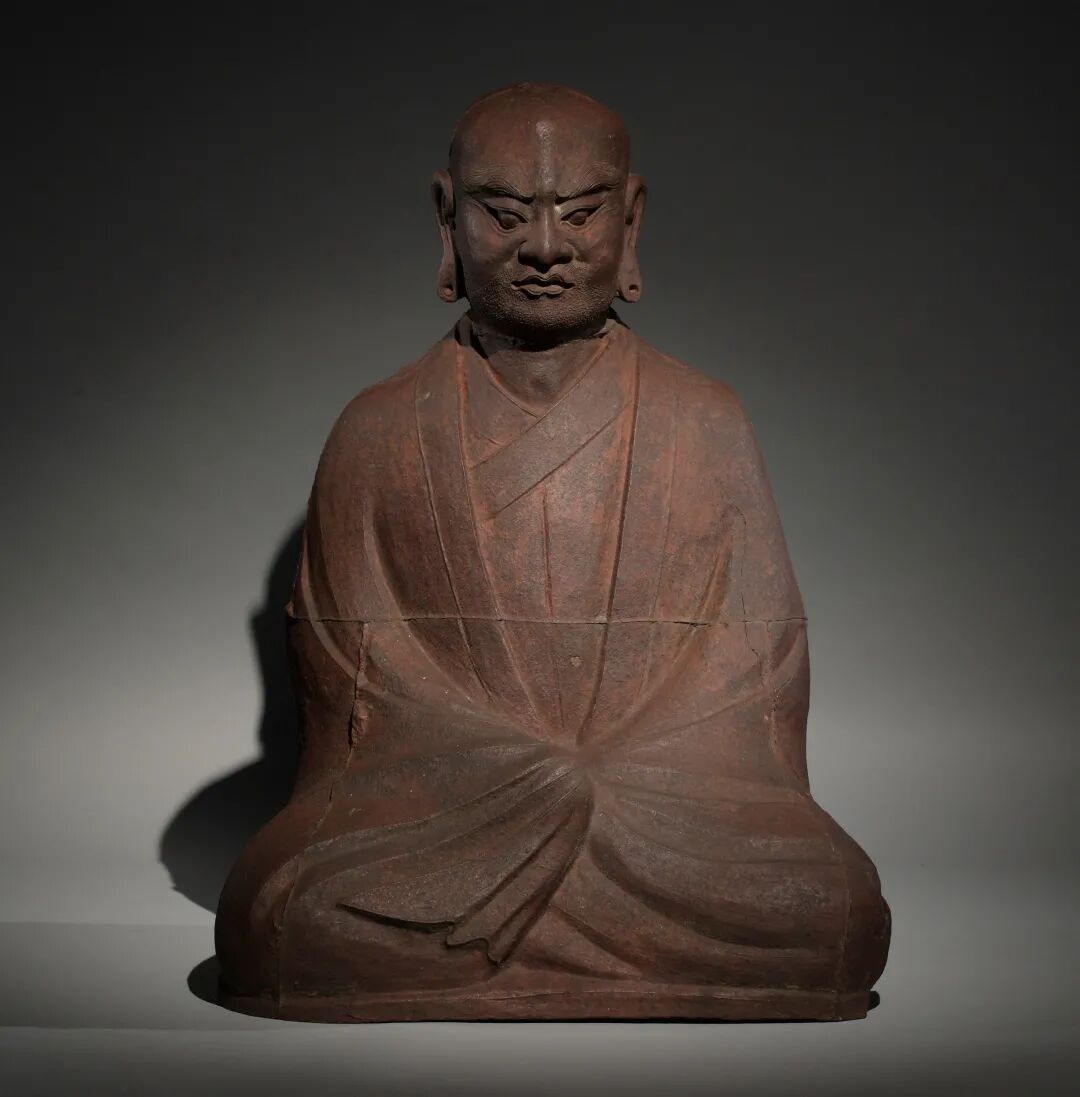 尺寸:78.7 cm X 53.3 cm X 35.6 cm罗汉又名阿罗汉,意指「一切思惑断尽」,自唐代开始见于各种艺术形式,有16至100名不等。罗汉是佛祖的弟子,公元437年译成中文的《入大乘论》中初次提到十六罗汉。公元653年,玄奘法师将十六罗汉之名详译成中文。一直以来佛教拥有诸多信徒,罗汉作为佛教信仰神仙中的一种形式,也长期受到人们的供奉。尊者面容肃穆,眉宇间清澈润朗,双眼有神,鼻梁高挺,耳垂长而厚。右手置于左手之上,盘腿而坐,显得悠然自得,大有看破凡尘、断除诸漏,而得大自在的状态。身上袈裟轻柔贴体,衣褶自然流畅,垂落于身边,刻画的十分简单朴素,极为写实。使其超越凡人的神格在尊者的面容上得到了恰如其分的表现,给人威严之感,创造了艺术表现力上的极致。罗汉身刻有铭文显示其时间为「明成化十七年」,供奉地为吉祥寺。吉祥寺分为南、北吉祥寺,此佛供奉处应为北吉祥寺。北吉祥寺,位于中国山西省陵川县礼义镇西街村,毗邻崔府君庙,与南吉祥寺相距约2千米,1996年被列为第四批全国重点文物保护单位。创建于唐大历五年(770),北宋太平兴国、元代至元及明、清各代均屡有修建。寺院建筑保存基本完整,主要建筑有前殿、中殿、后殿、东西配殿及左右廊庑等。前殿、中殿均为宋代遗构,尤其是中殿,单檐悬山顶,梁架简洁、建筑手法古朴,保留了更多的北宋风格。后殿为明代建筑。寺内还存有北宋太平兴国三年(978)至明、清时期碑刻多块。寺院布局严谨,规模较大,是一处保存基本完好且颇具地方风格的古建遗构。故宫博物院和大英博物馆都有与其相似的罗汉摆件,此摆件价值不言而喻,是为一件不可多得的收藏精品。参见故宫博物院馆藏一尊明弘治十年铁罗汉像,极为相似,编号新00104396 (fig. 1)。另见大英博物馆藏一尊坐像,编号1990,0413.1 (fig. 2)。fig.2 : The Trustees of the British Museum.fig.3:此尊罗汉背刻铭文显示其年代为“明弘治七年”,与本拍品风格近似。