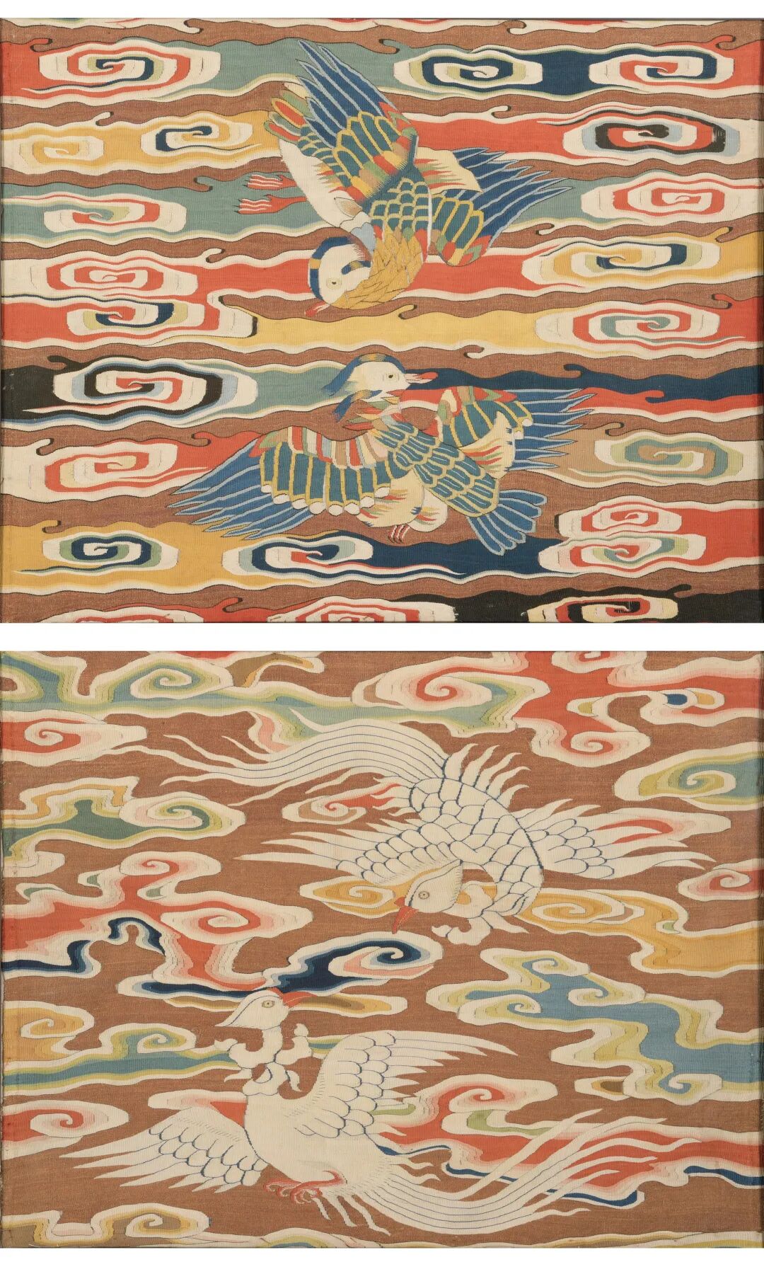 黄花梨平头案木纹致密,亮泽如蜜,云纹牙条,腿足缩进安装,尽现传统中国家具之经典。条案形制、尺寸多样,此画案线条比例,曲直合度,宜作多方用途。案面以标准格角攒边,下带两根穿带出梢支承。边抹冰盘沿微向下内缩,至底压窄平线。两侧脚的腿足呈倭角祥云型,至上端开口嵌夹云头形牙头的牙条,沿边起线,细节考究。腿足间安两根椭圆形倭角梯枨。此桌以整块黄花梨材料作为面板,实属难得。黄花梨从古至今都是珍稀木料,其生长缓慢,一般需要60年甚至上百年方能成材,像此桌用所用的黄花梨材料最少要上百年的树龄才能达到这般大小,并且桌子所有的黄花梨选料都非常厚实上乘。当时能用此桌的绝非普通贵族,应是宫廷所有之物。此桌属于中小型的长方案形结体,主要为饮酒用膳之用。明代宴饮往往主客两人共用一桌,宾客多时,则人各一桌,故而大大增加了此类桌案的需求量。除此之外,酒桌也可靠墙摆放,用于陈设古玩字画和花卉盆景。酒桌大小适中,侧脚收分,结构紧凑,原型可以追溯到宋代的家居陈设。此桌结构紧凑,做工素雅,朴质简练,平淡耐看,用途广泛,与明代古朴典雅的审美相符,又有清代家具的特点,黄花梨大件整料尤其难得,像此桌如此大件极为难能可贵,又是一件集实用与收藏于一体的精品,值得藏家慧眼识珠,纳于旗下,传承百世。参阅故宫博物院馆藏平头案,编号故00206487 (fig. 1)。另见苏富比纽约2016年03月拍卖,编号008;佳士得香港2012年11月拍卖,编号2003。来源:来自德克萨斯州威廉先生的旧藏。威廉先生多年来专注收藏佛教艺术品,流连于西藏、香港以及欧洲的收藏市场,有五十多年佛教雕塑、绘画以及法器方面的收藏经历。其藏品范围涵盖印度、巴基斯坦、尼泊尔、西藏和中国中原地区。本拍品购自纳高拍卖行2010年5月7日拍卖,拍品458号。乾隆三十一年(1766)完成的《皇朝 礼器图式》定型了补服规制:皇帝衮服,绣五爪正面金龙四团,两肩前后各一,其章左日右月,前后万寿篆文。简言之,圆形补子的等级高于方形补子;团纹越多,等级越高;正龙高于行龙,龙高于蟒,蟒高于飞禽和走兽 。乾隆时期定制后,衮服多为日、月两章,亦间有四章和十二章;嘉道以后,皇帝衮服基本沿袭乾隆朝定制。本品圆领,对襟,平袖,直身式,四开裾,缀铜鎏金錾花盘扣五枚。石青素缎服面。两肩及前后襟绣五爪正面金龙四团,两肩金龙用十二章纹为饰,其章左日、右月。前后衣襟金龙用八宝为圈饰。四龙龙身皆环以五色云、红色蝙蝠、寿桃与灵芝等吉祥纹饰,以寓洪福齐天。衮服为朝、祭等庄重的礼仪场合穿用的服饰。本件衮服四金龙都是正面团龙,定是为当朝皇帝所用,故珍贵非凡,值得收藏保存。参阅故宫博物院藏清道光石青色缂丝四团彩云金龙纹貂皮小衮服,编号故00045124(fig. 1)。佳士得纽约2020年9月拍卖,编号1624。来源:来自德克萨斯州威廉先生的旧藏。威廉先生多年来专注收藏佛教艺术品,流连于西藏、香港以及欧洲的收藏市场,有五十多年佛教雕塑、绘画以及法器方面的收藏经历。其藏品范围涵盖印度、巴基斯坦、尼泊尔、西藏和中国中原地区。缂丝,又称「刻丝」,是中国传统丝绸艺术品中的精华。是中国丝织业中最传统的一种挑经显纬,极具欣赏装饰性丝织品。宋元以来一直是皇家御用织物之一,常用以织造帝后服饰、御真(御容像)和摹缂名人书画。因织造过程极其细致,摹缂常胜于原作,而存世精品又极为稀少,是当今织绣收藏、拍卖的亮点。明代前期、中期的文官补服图案多用双禽表现,晚期才改为单禽。其图案崇尚简洁大气,色彩鲜明。此件拍品为典型明中期缂丝文官补子。其中一件作品为四品文官补子,画面上下两只鸳鸯相对而望,四周彩云缭绕。鸳鸯古称「匹鸟」,据说鸳鸯成对,鸳鸣鸯和,左雄右雌,双双飞翔,夜晚雌雄羽翼掩合交颈而眠。若其偶失,从不再配。《诗经小雅》载:“鸳鸯于飞,毕之罗之。君子万年,福寿宜之”,体现了古代「五伦」中夫妻美好的关系,是一种吉祥的瑞鸟。其作为官员的补子,是取其羽毛上耸,象征坚定忠心;眠宿如有敕令, 喻其兢兢业业。另一幅作品为五品官员补子,两只白鹇两两相望,周围金地满布祥云。白鹇形体很像野雉,羽毛白色,有细黑纹,面颊赤红,脖子有青毛如丝,尾羽很长。白鹇产于南方,自古以来一直被视为吉祥物。白鹇还是一种忠诚的 「义鸟」。传说宋朝少帝赵昺在崖山时,人送白鹇一只,他亲自喂养在舟中。少帝投海殉国后,白鹇在笼中悲鸣奋跃不止,终与鸟笼一同坠入海中。后人称白鹇为「义鸟」。所以,白鹇鸟的形象作为五品官员补子,取其行止闲雅,为官不急不躁,并且吉祥忠诚。此画幅采用平缂、勾缂、长短戗、木梳戗等缂织技法,缂工精致,技法纯熟多变,是两件极其难得的馆藏级明代缂丝珍品。两幅作品在古时就是忠贞不二,吉祥闲雅的象征,现经装裱入框,成为了现代时尚的装饰精品,也代表了比翼双飞,执子之手的美好寓意,是藏家们收藏与实用并存的精品之作。可参阅大都会博物馆馆藏,编号36.65.31 (fig. 1);英国维多利亚和阿尔伯特博物馆馆藏,编号FE.11-1986 (fig. 2)。