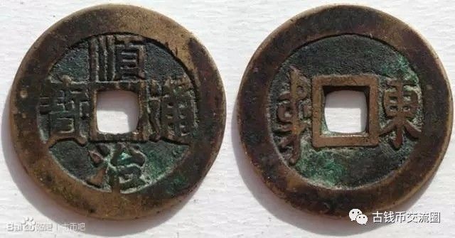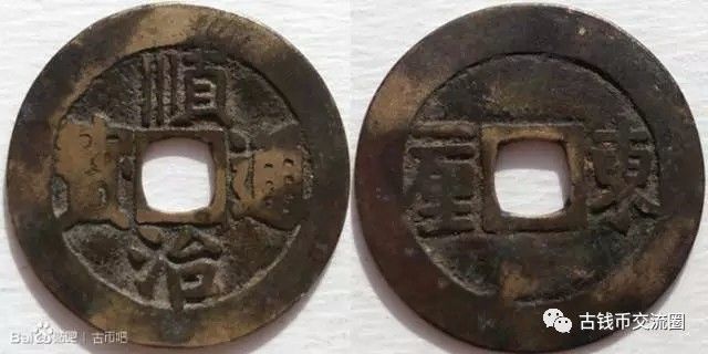 公元1644年,清军攻入关内,清爱新觉罗·福临入关。在北京设铸钱局铸钱,于工部、户部开设宝源局、宝泉局,后随着天下统一,在各地开钱局,并铸“顺冶通宝”。在清军刚入关时,允许明钱流通,但不久即严禁使用明钱及其它古钱,独行清钱。顺治年间对制钱成分有明确规定,即铜七成,白铅(锌)三成,称之为“黄铜”,一千铜钱称为一串,年铸一万二千串称为一卯,即每开一期的额定数称为“正卯”,正卯以后凡有加铸数称为“加卯”。