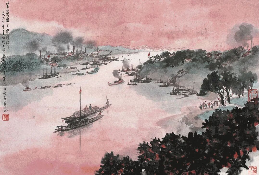 “芙蓉国里尽朝晖”(1964年作),与前图大不相同的是,天空、水面,相互映照着虽淡犹浓的绯红。这借之于水彩画的渲染,让画面充满通明亮丽的朝晖。墨叶朱点的桔林、石绿铺染的田野、往还的水中舟楫及岸上喧腾的厂矿……这是一个生机勃勃的世界。