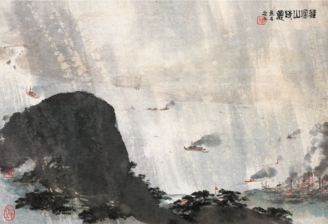“登庐山诗意”(1965年作)画面近景为“飞峙大江边”的庐山,简率而具磅礴气象:潆潆风雨中的是开阔的长江、江上的行舟和江岸的港口、厂矿。该图的特点在虚和淡,那种“山色有无间” 的妙处,是抱石先生所独具的。