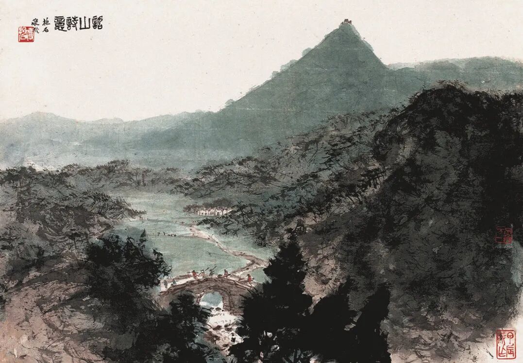 “韶山诗意”(1964年作)写韶山冲全景:山峦、丛林、溪桥、农田、村舍和点缀其间的人物活动。韶峰耸起一段苍翠——这是抱石先生最喜用的加了墨的植绿。这溢发着生机的色彩,似有沁人肺腑的作用。乱麻皴与墨色的点掇、渲染融为一体,造成了令人陶醉的繁茂清逸的境界。巧妙留下的空白:溪流、屋壁、连接田野的小道,彷佛人的面部的眼白,让读者胸中一亮,这是山水画的点睛之笔啊!