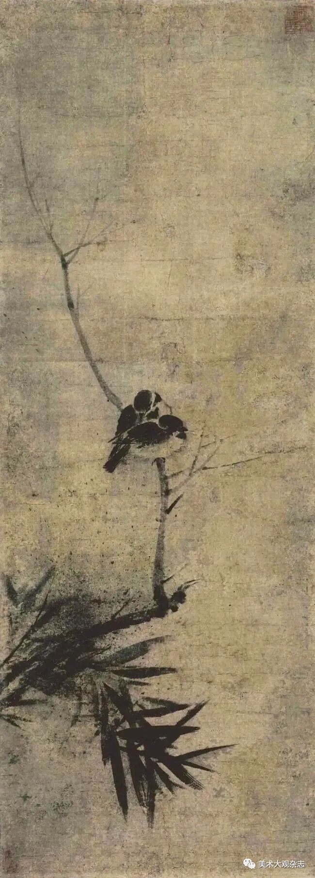 进入南宋以后,皇室在继承北宋传统的基础上,更是把花鸟画发展到精微、细腻、极富诗情画意的高度,而伴随着山水画的构图从全景式变成边角式,艺术家们在花鸟画上更强调表现景物的远近和疏密等视觉美的因素。再加上此时的政治中心已从寒冷肃杀的北方,迁移到风景秀丽柔和的临安,南宋艺术家们的兴趣也由营造立体的空间感,转换到力图用墨色来表现烟雾迷蒙的江南景色。这点正如宾扬在《远东的绘画》中所指出的: 宋代(南宋)绘画不是通过线条,而是通过墨的浓淡来呈现山光水色的江南,创造出一种具有浓郁抒情风格的画境。同样地,花鸟画也从描绘自然万物的全貌转为截取一枝一叶,取近景以写实手法来表现全貌的手法。[20]南宋文人士大夫都深受佛禅思想的熏陶,他们的艺术创作活动更浸染了禅宗“即心即佛”的思维模式。“即心即佛”就是说不需向外求佛,你的自心即是佛,受此影响,艺术家们不再追求外在的“形似”,而去追求包括人类在内自然万物之间的一种精神共同点,即“神似”,其结果是艺术表现更加自由、缥缈。