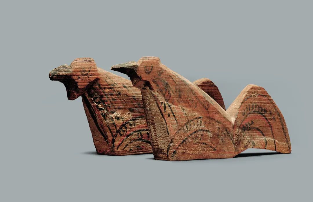 这组陶骆驼为红陶质,立于托板上,双驼峰,作仰首嘶鸣状。