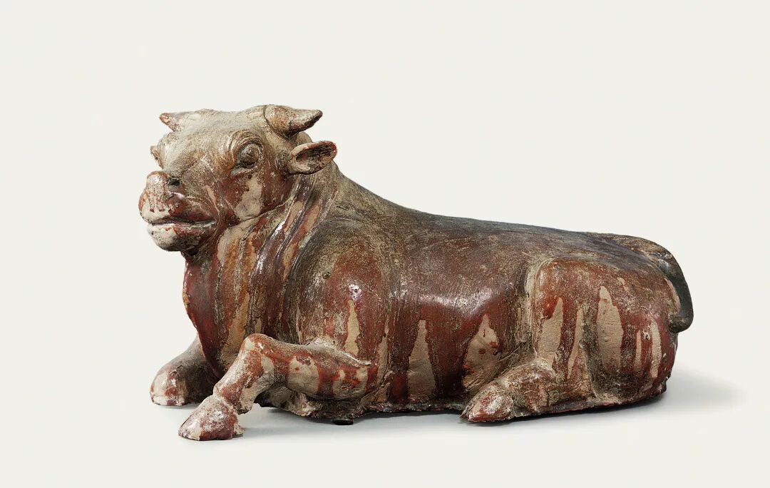牛身施褐色釉,呈俯卧状。头部高抬,双目圆睁,凝视前方,呈现出沉静、安详的神态。