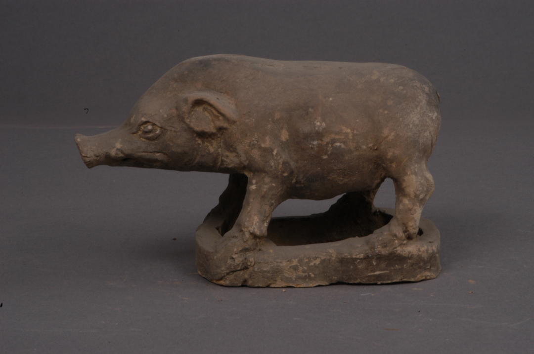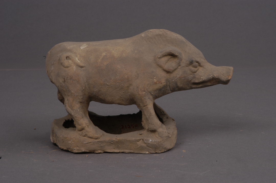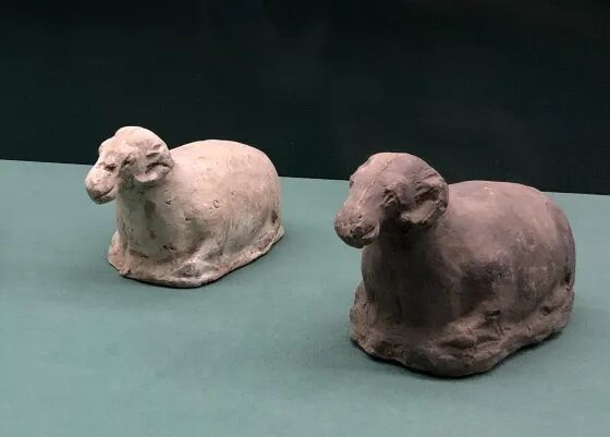 这对陶羊为灰陶质,跪卧于地,系模制。