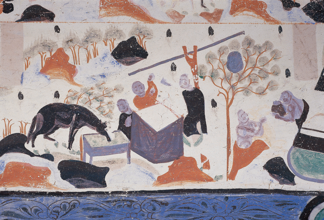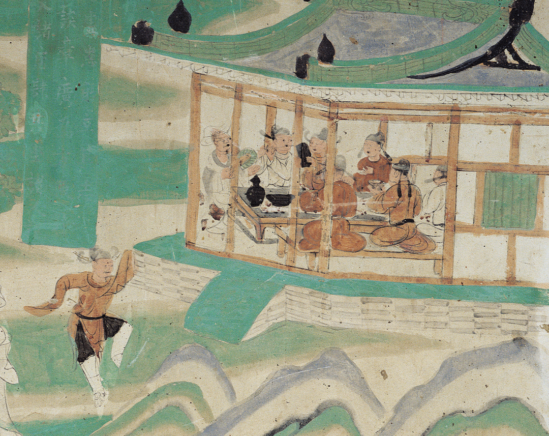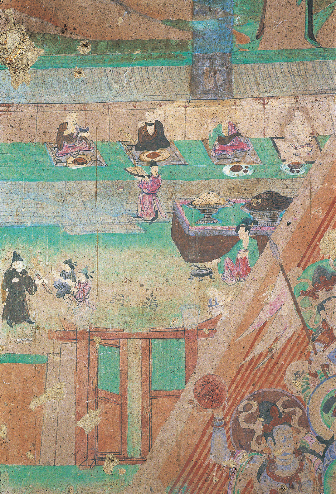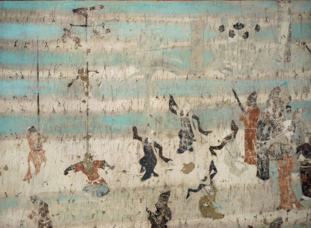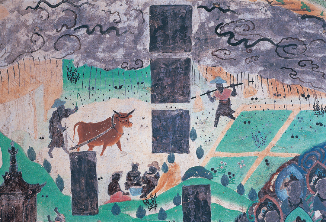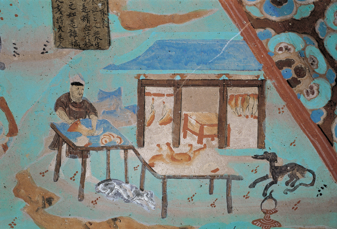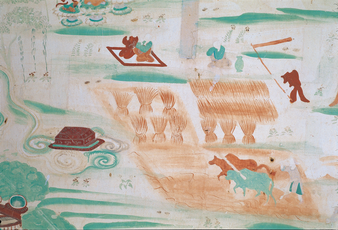 敦煌壁画以佛教经典及故事为主题,除了表现宗教内容还有大量反映古代社会生产、生活的画面。有农民耕种、收割、打场、扬场;手工业者建筑、绘画、制陶、锻造、酿酒;市井百业中商人、屠户肉坊、酒肆、弈棋、百戏以及反映婚嫁、丧葬习俗的画面。这些内容丰富、形象生动的壁画,不仅为我们展示了当时社会不同阶层在生活中的喜、怒、忧、思,以及由此产生的生、老、病、死的生命现象,也展现了中古时期人们生活习俗、社会风气、风土人情画卷,是我们了解古代人们生活的珍贵资料。