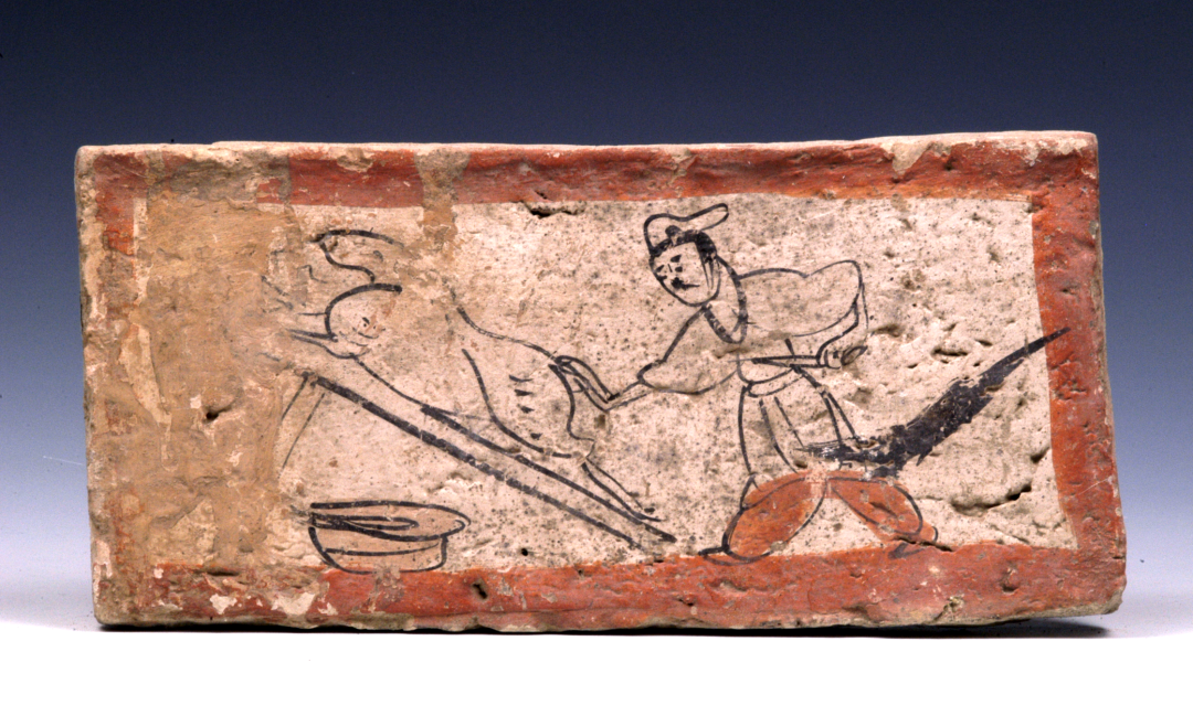 画面为一庖丁正在宰羊,羊已置案上,庖丁右手按羊,左手执刀,下置一圆盆,用于接血。画面再现了魏晋时期河西地区的社会生活情景。