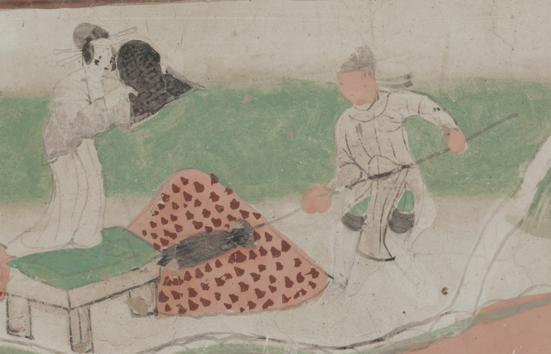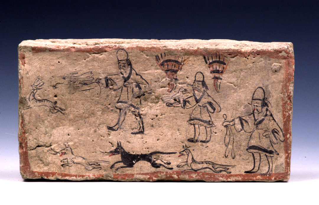 三猎人放鹰犬追逐逃兽,左侧猎人放鹰追鹿,中间猎人手臂落一猎鹰,画面下方有三只猎犬,呈飞奔状。画面简洁疏朗,狩猎场景生动形象。