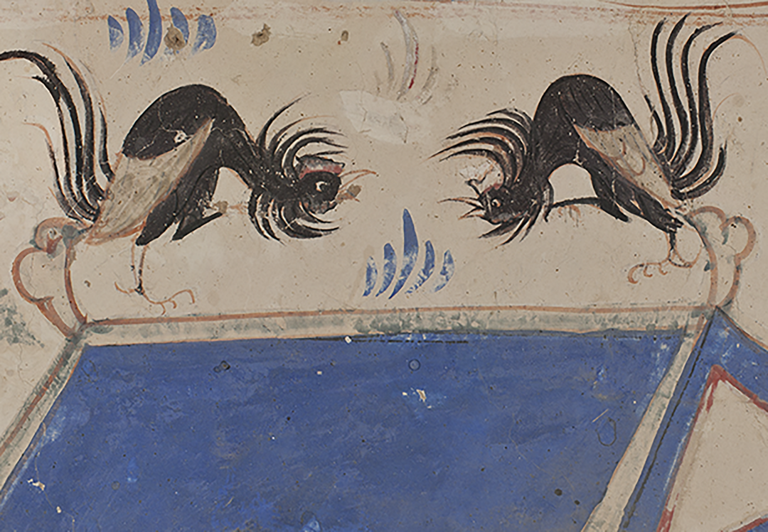 两只鸡呈俯卧状,均用木块削成,鸡头前伸,尾羽下垂。以黑、红双彩描绘出公鸡和母鸡的鸡冠、眼睛和羽毛。造型概括,风格洗练。
