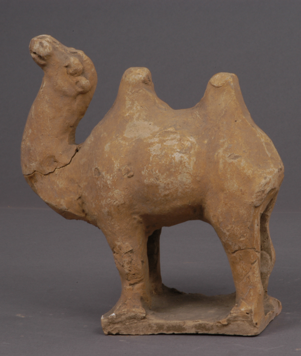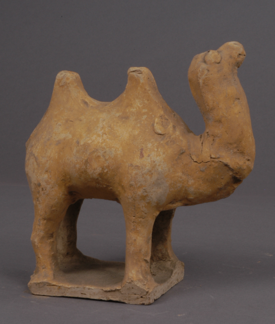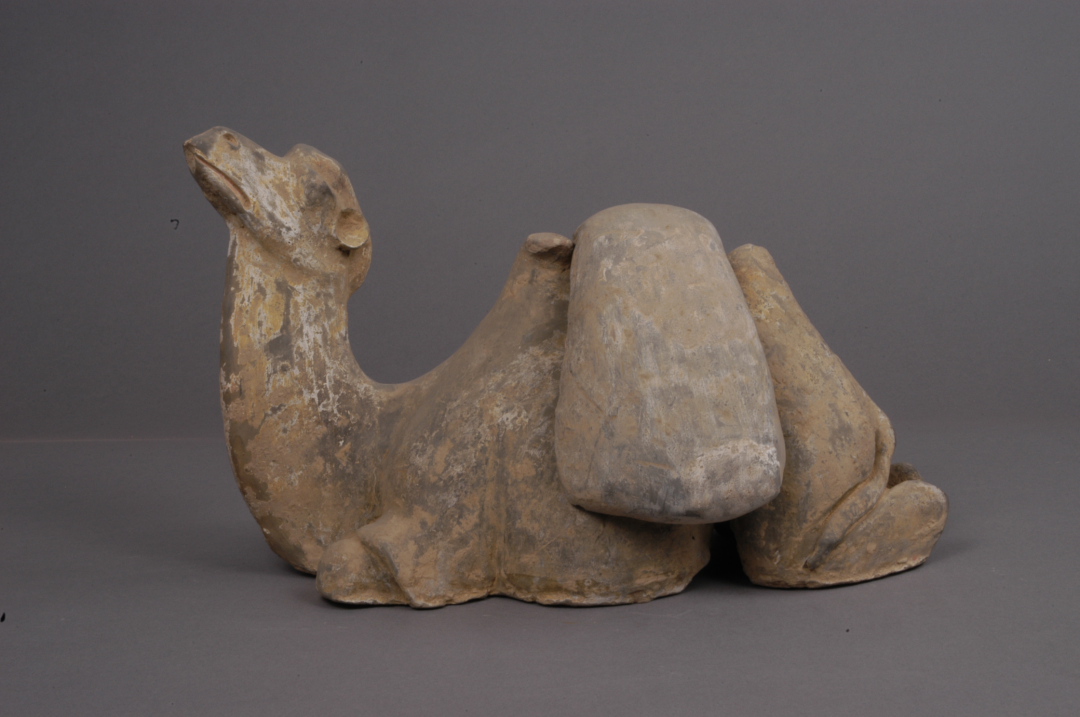 骆驼为灰陶质,双峰间驮有货物袋,仰首跪卧于地。