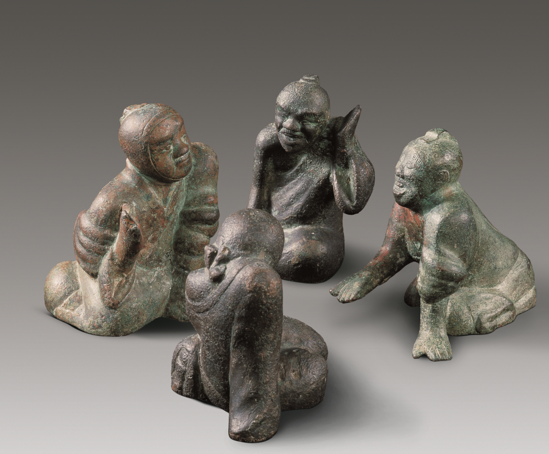 六簙是古代的一种智力博弈游戏,汉代最为盛行,其游戏规则与方法已经失传。出土时四俑相向跪坐,中间放置长方柱形牙质棋子(三枚完整),是游戏六簙的场景。研究者依据俑的形态和出土时的位置,推测这组铜俑为当时镇压席子的席镇。