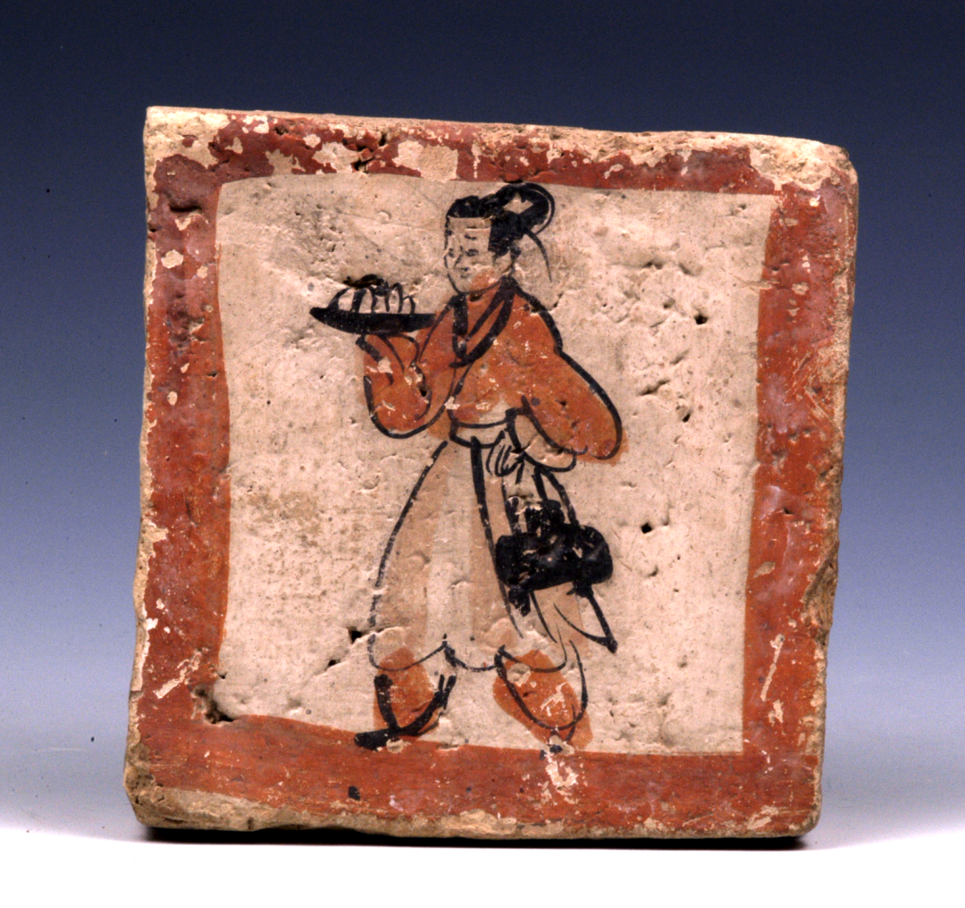 女子右手托槃,左手提柙,举步前行,在传送食物。