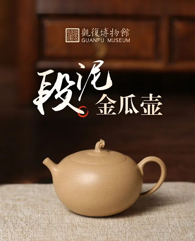 观复博物馆取上等原矿青段泥,以南瓜为形,仿田间瓜果的形态,打造了一款段泥金瓜壶