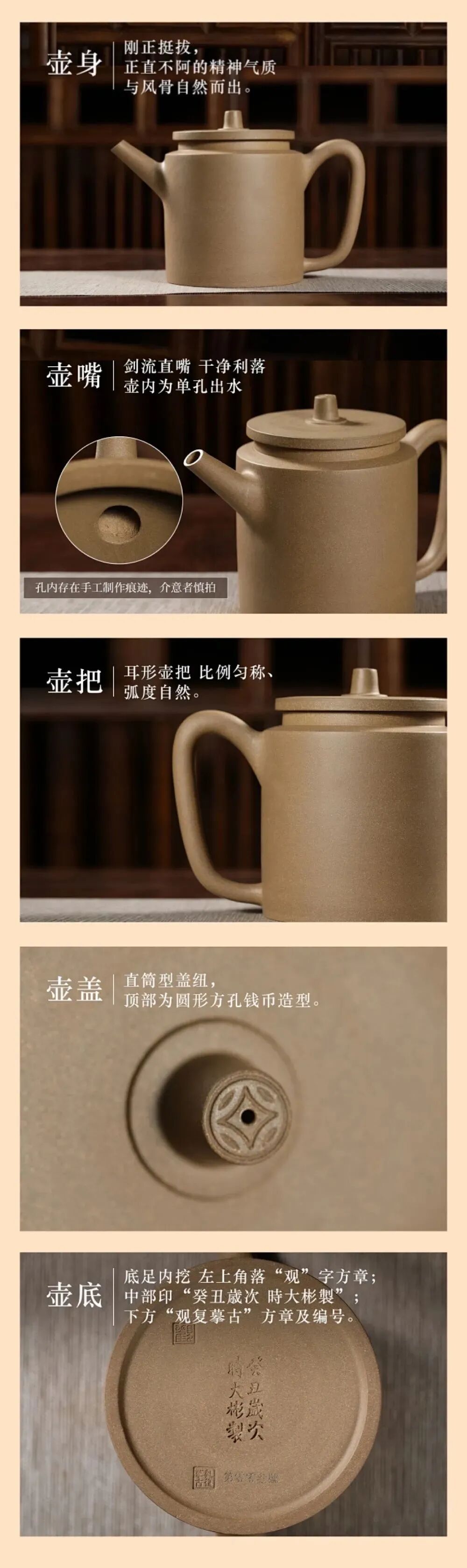 整壶简洁大方,直筒型的壶身刚正挺拔,如《周易》中“君子当直道而行”的写照。