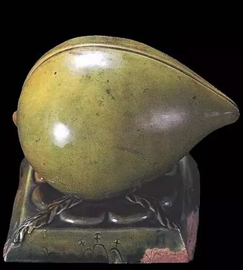 黄绿釉桃形器 北宋 高9.6 底边长8.3厘米 1969年河北省定州市贡院内北宋太平兴国二年(977年)静志寺塔基地宫出土,现藏于定州市博物馆。