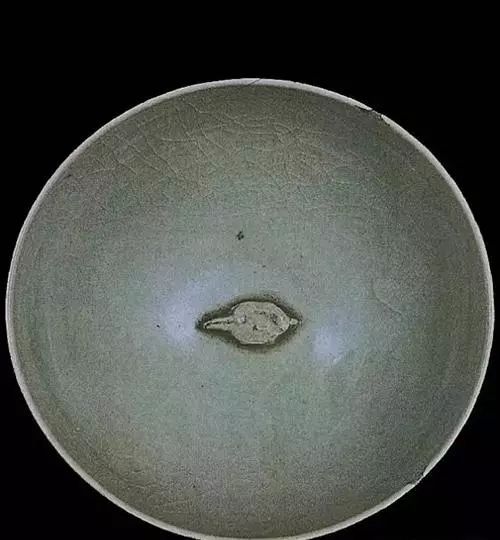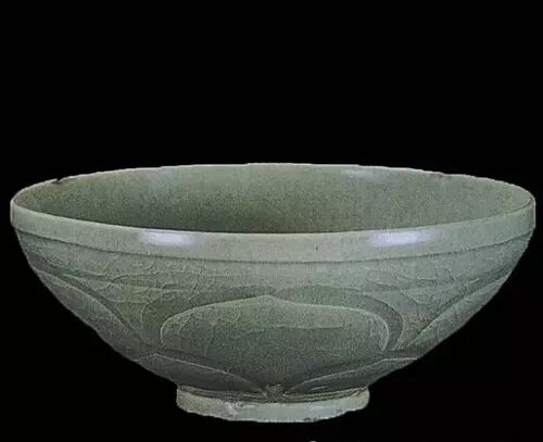 尖唇,敞口,曲腹下收,矮圈足。瓷胎色灰白,釉面润泽,施淡青色釉,布满大块开片,玻璃质感很强,釉色润泽,施满釉,足底露胎。碗口饰弦纹一周,处腹刻宽体仰莲瓣纹两重;内底心附一小龟,盛水后似龟游水中,整体上表现宋代十分流行的龟荷图案,匠心独具。陕西铜川耀州窑烧制。