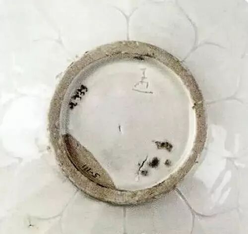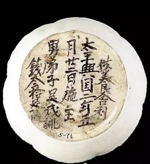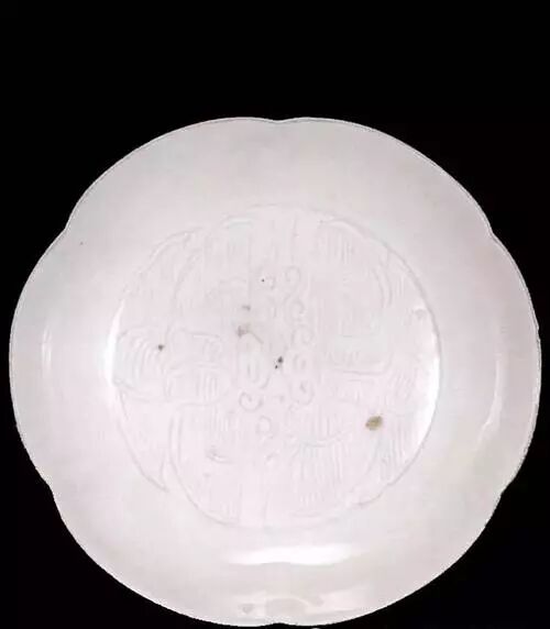 尖唇,六曲花形敞口,斜腹略鼓,大平底,胎极薄,仅0.2厘米。胎色洁白,质坚细。白釉色如凝脂,略见闪黄,莹润光洁,有垂釉痕,施满釉,仅底部露胎。内底划花装饰,为工整纤细的对蝉纹;外底刻行书“官”字款;并墨书“供养舍利太平兴国二年(977年)五月廿二日施主男弟子吴成训钱叁拾足陌”5行28字。盘仿金银器器型,口部无釉。为河北定窑北宋初期产品。