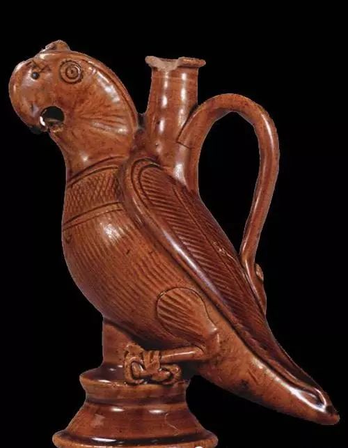 低温铅釉器。壶作鹦鹉形,鹦鹉立于覆盆状底座之上,以模制加刻划的技法制作;勾喙为壶流,双目圆睁,头顶饰流苏;背负一长颈注,注口圆唇外侈,注颈与鹦鹉背之间安片状半环柄;鹦鹉体态肥壮,长尾微翘,篦划羽纹,胸部饰斜格纹宽带,又在柄端贴附泥钉;圈足底面墨书“鹦鹉”二字。胎呈黄褐色,质粗松。通体施黄釉,釉色黄棕,莹润亮泽。在定窑遗址发掘中有三彩器残片出土,该遗址近旁五代墓也出土两件三彩器,因此可推测为河北定窑产品。