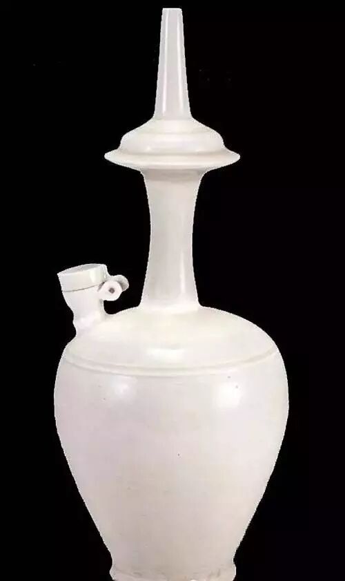 小口,长径,上细下粗,颈中部有一圆形相轮状圆盘;圆肩,肩部堆塑葫芦形流与瓶腹相通,流上有圆盖,盖边塑一圆环与流上所塑圆环可相系,以稳定流盖;鼓腹,下腹内收,圈足稍外撇。瓷胎色白细腻。釉色洁白,透明润泽,垂釉痕呈青色;施满釉,圈足底部露胎,有窑粘。相轮及肩划饰弦纹,其余部分光素无纹。器形修长秀美,纹饰素朴。为河北定窑北宋初期产品。