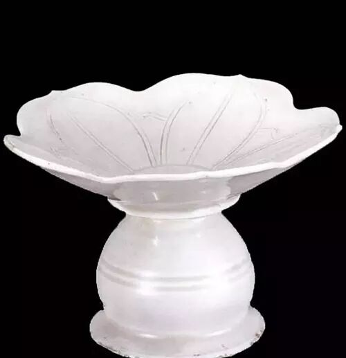 上部做成盏形,尖唇,五曲尖瓣花式口,腹璧斜敞,玉璧底;下接水盂形腹,略呈覆钵形,斜溜肩,垂腹,大圈足外折。胎质细白坚硬。釉色洁白,透明莹润,外壁垂釉痕闪黄,施满釉,高足内壁无釉。扣内用细线划花出五瓣莲花,与刻出的瓣口一道表现花口;高足饰弦纹。为河北定窑北宋初期产品。