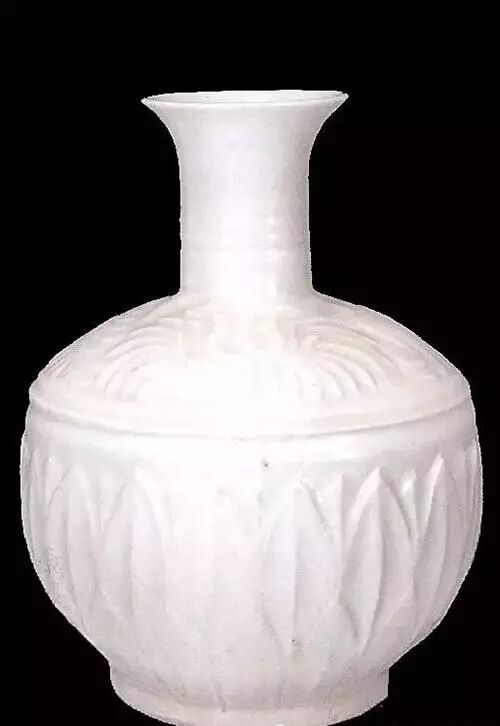 尖唇,侈口,细长颈,圆折肩,圆鼓腹,腹璧较直,底部内收,矮圈足。白胎,细腻坚致。釉色白泛青,匀净润泽。颈部饰凸弦纹两道,肩部刻刻蕃莲纹,肩与腹相交处有一道凸弦纹,腹部用浮雕法刻三重仰莲纹。应属于河北定窑北宋初期产品。