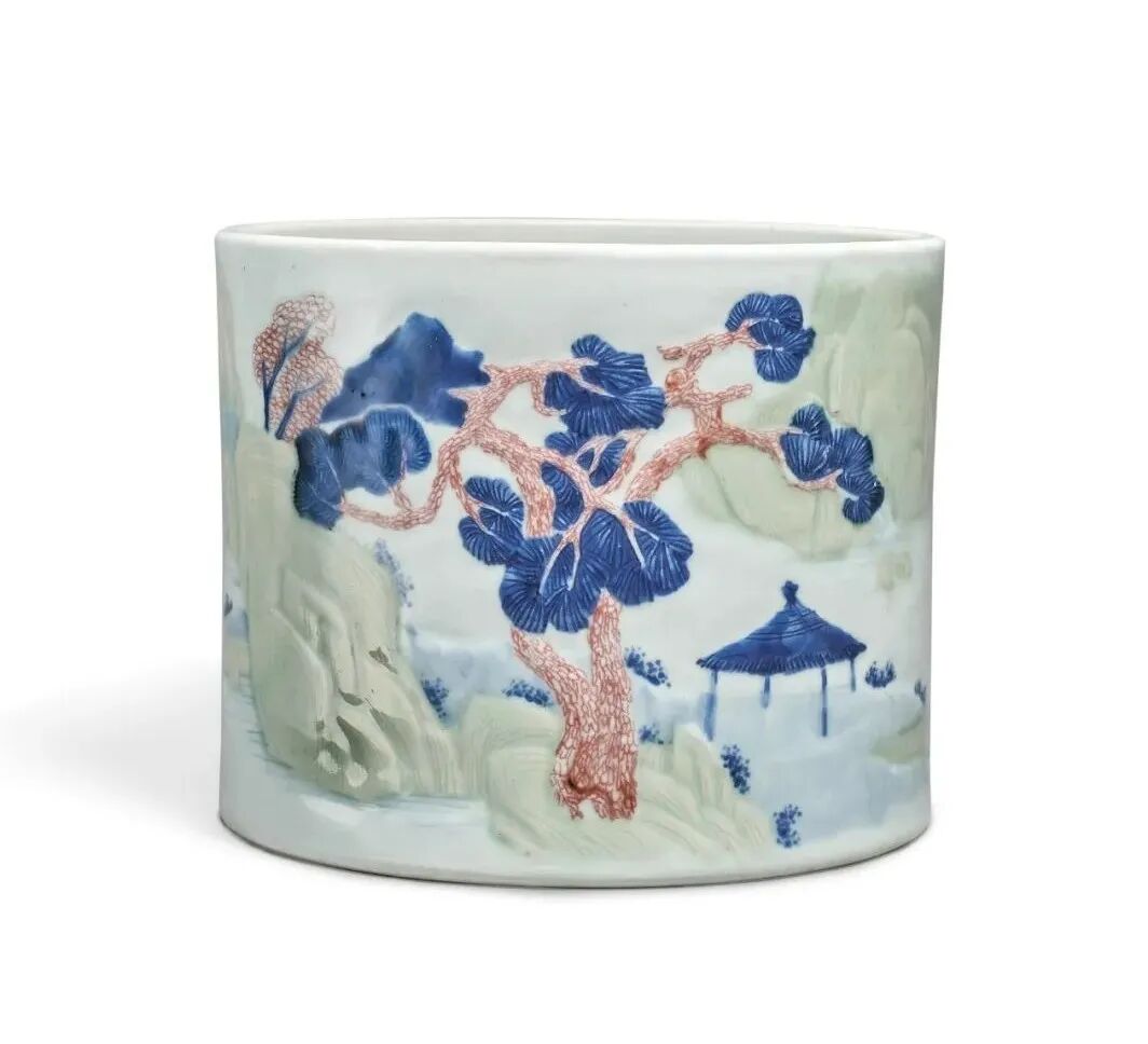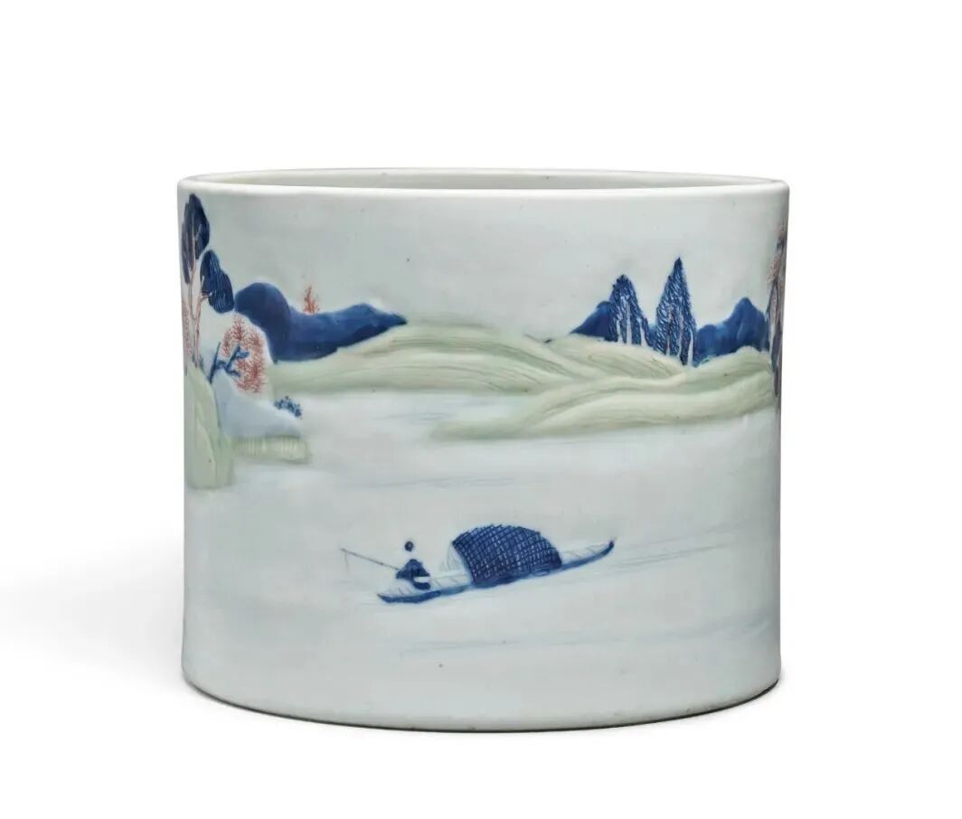 清康熙 釉里三彩孤帆独钓图笔筒 《大清康熙年制》款