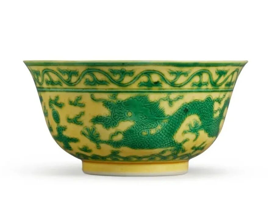 清康熙 黄地绿彩堆花祥云纹盌 《大清康熙年制》款