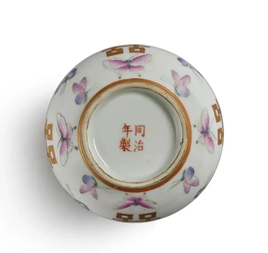 清道光 胭脂红地轧道粉彩开光博古图盌 《大清道光年制》款
