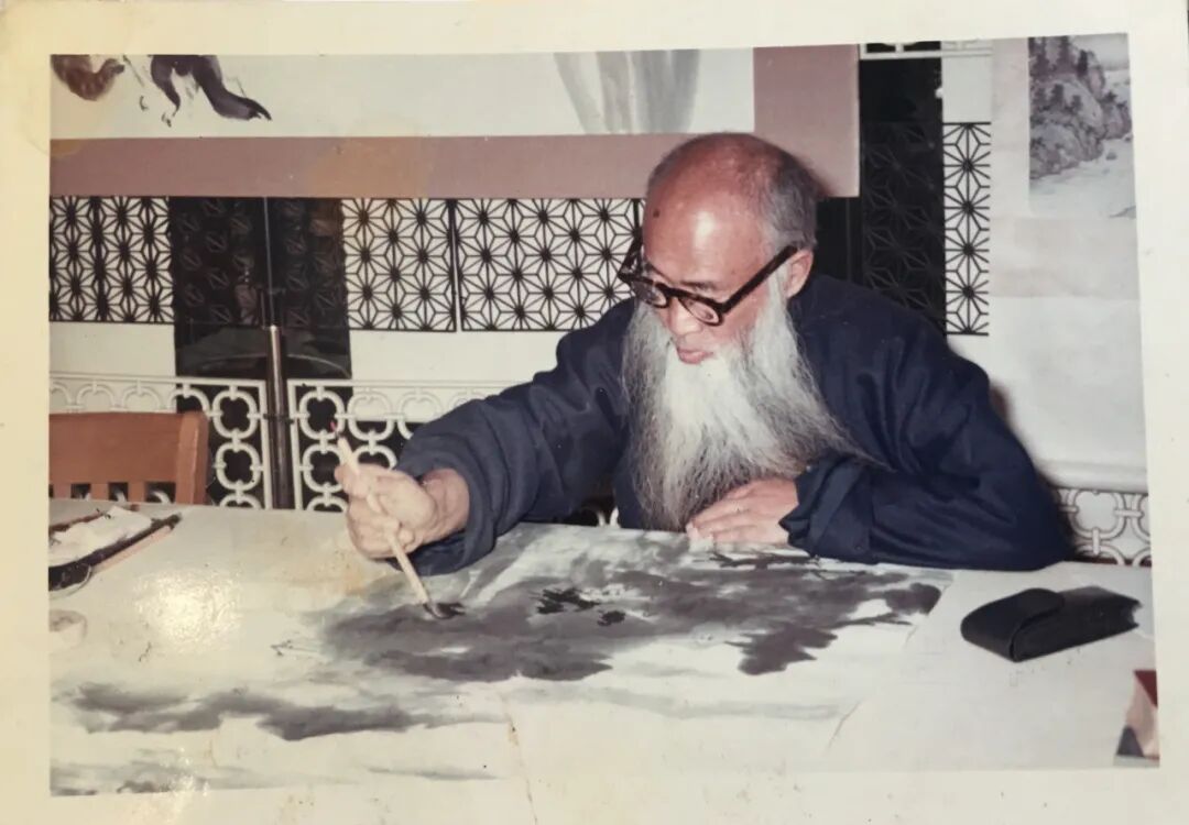 林清霓(1914-1974)原籍廣州,後移民舊金山,1965年在舊金山中國城開設了一家專營中國藝術的畫廊。可惜的是,在張大千到訪之時,林清霓的畫廊因門庭清淡,經營舉步維艱。據當時在場人士回憶,張大千特作此畫以支持林清霓的畫廊事業。畫上大千題識:「清霓老友別逾十年,相逢舊金山,執手欣然,清霓丰采猶少,而予皤然一叟矣。為寫數筆以記良晤,明日予即歸三巴之摩诘山園,重來之約訂在秋風桂子飄香之候也。丁未年三月十五日大千弟張爰。」成畫之後,張大千有意將作品出讓於當時在場之人士,舊金山畫商曹仲英當場以九百美金慷慨購下,所籌資金正好幫助解決了畫廊的燃眉之急,是為兩全其美。而大千在林清霓畫廊揮毫創作之景,則被鏡頭所記錄。更多關於張大千在加州灣區的活動,參見John Seed,"Driftwood on a Heaving Sea: Zhang Daqian in the Modern West", Arts ofAsia,2019年7-8月, 頁84-95。