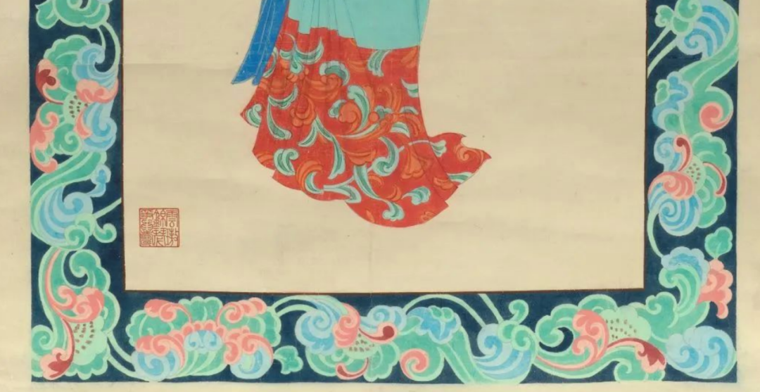 而敦煌这一路风格的仕女,如果只是白描也不行,形成“大千牌”的重要因素是石青、石绿、朱红等矿物颜色,用现在制造业的专业术语说,叫舍得“投料”,贵重的矿物色堆满,显得非常有诚意。而且在边框,衣纹的花纹勾勒,也是极尽精致。