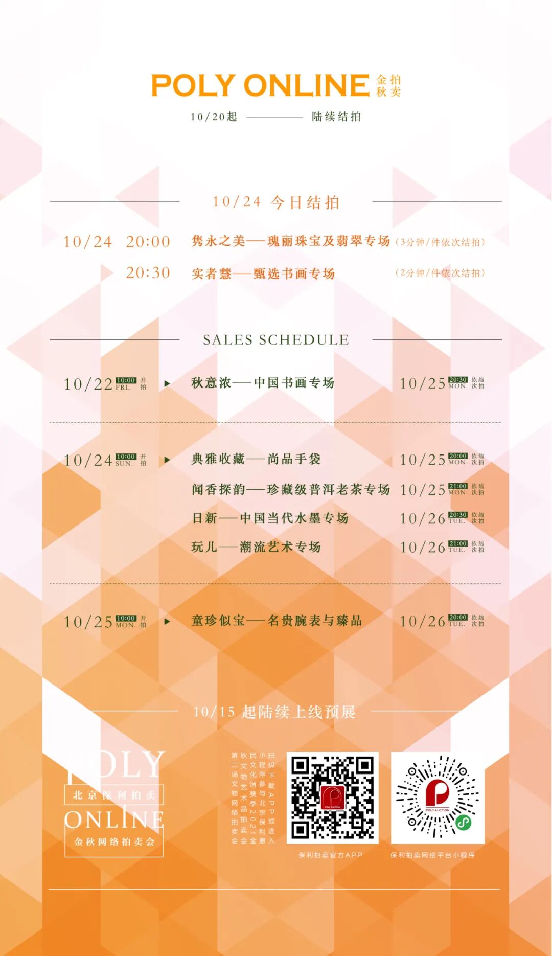 更有“日新-中国当代水墨专场”、“典雅收藏—尚品手袋”、“闻香探韵-珍藏级普洱老茶专场”及“玩儿-潮流艺术专场”开放竞投,各专场场次安排如下。您可以通过保利拍卖APP或微信小程序“保利拍卖网络平台”进入限时拍专场参与竞投,或直接点击下方专场图片进入专场,诚邀您的参与~