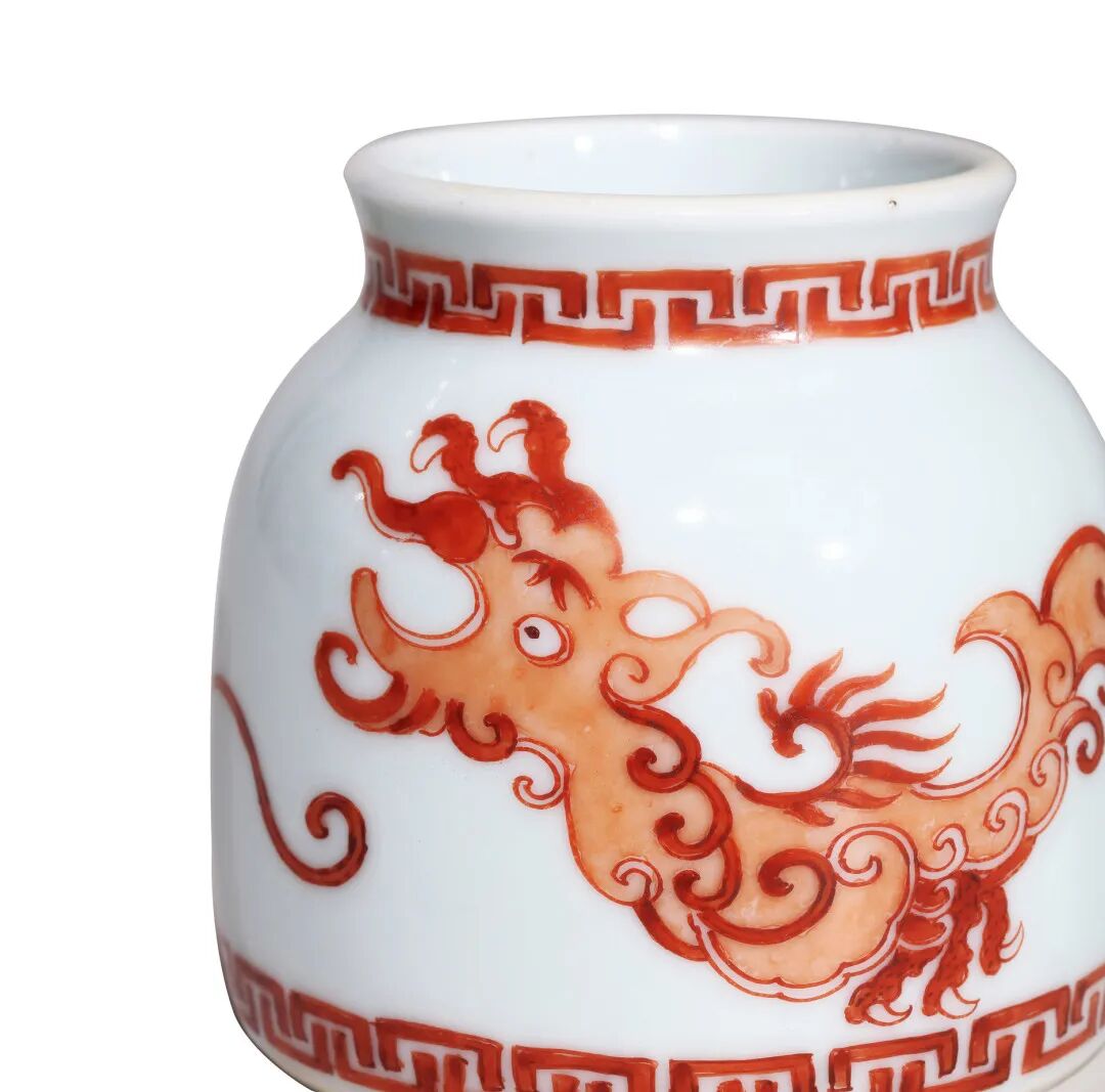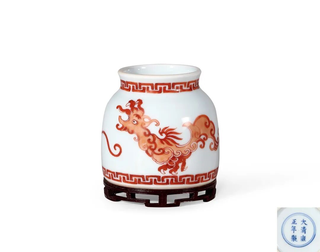 本品造型简洁,形制精巧,为雍正御窑文房稀见品种。阔口短颈,腹部微向内收,平底圈足,通体施釉白晰滋润,外壁以矾红描绘纹饰,口沿及足胫处绘变形蚕纹一周,主题纹饰为夔凤纹,夔凤鹰嘴利爪,翎羽飞扬,绘画技法以平涂及留白为主,仅以深浅不同的两种红色表现,画面充满了古朴神秘的气息。底青花书“大清雍正年制”六字双行款书款识,笔法工整清健。