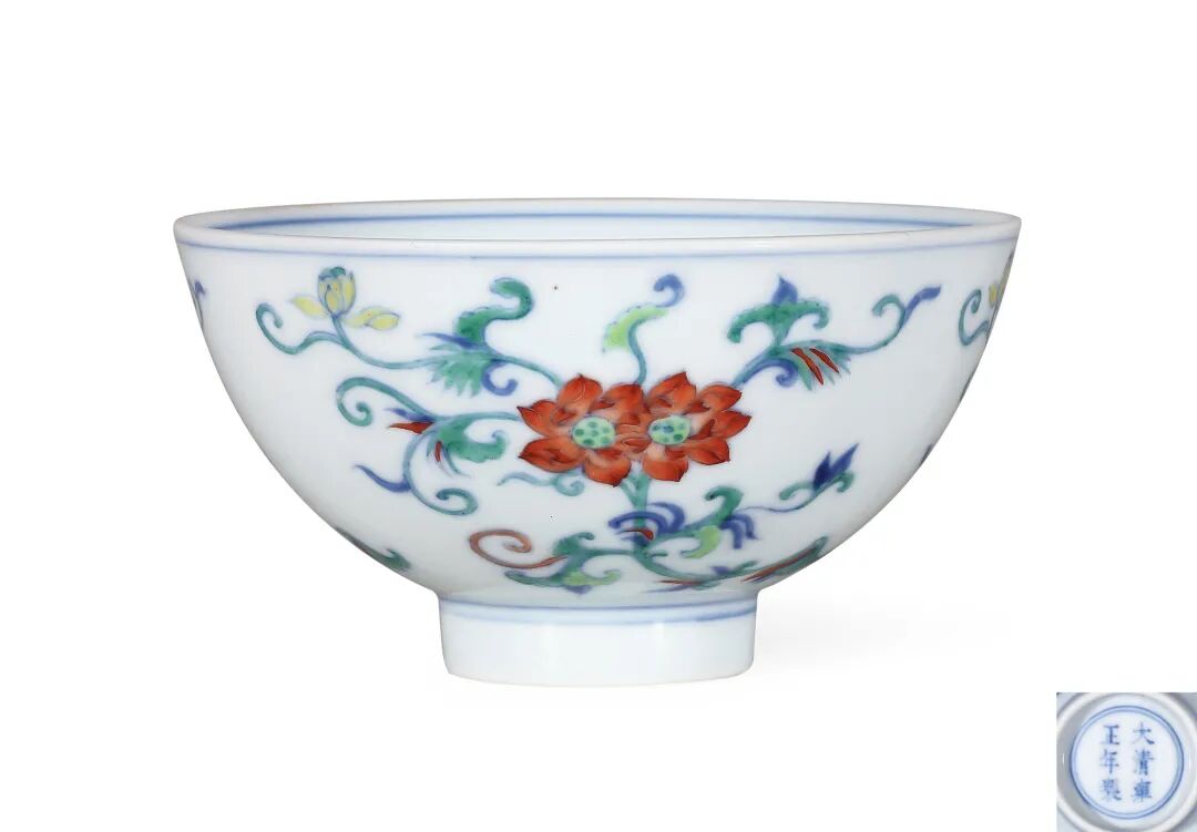 本品造型小巧精致,胎质细腻润白,剔透无瑕,外壁 以斗彩工艺装饰三组并蒂莲花,碗内底绘一把莲,整器设色清雅,填彩准确。以矾红绘制的并蒂莲具有阴阳透视效果,华丽富贵。底落“大清雍正年制”青花楷书款。外壁所绘并蒂莲。此式斗彩并蒂莲纹碗为清代官窑经典品种,始烧于雍正时期,历朝均有烧造。