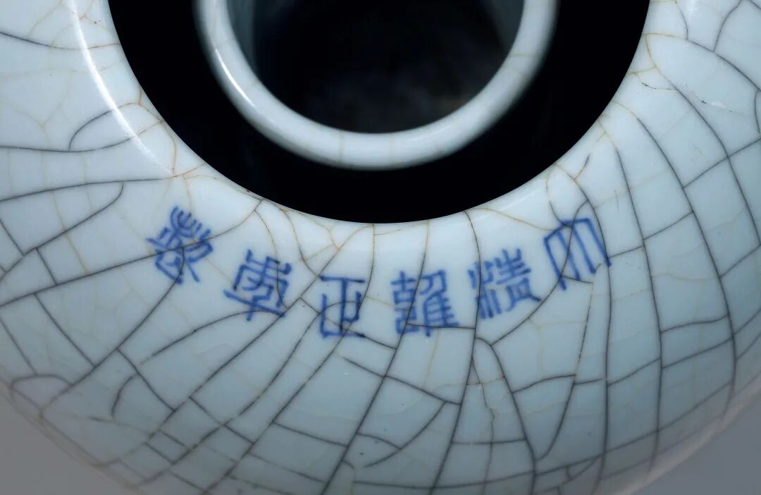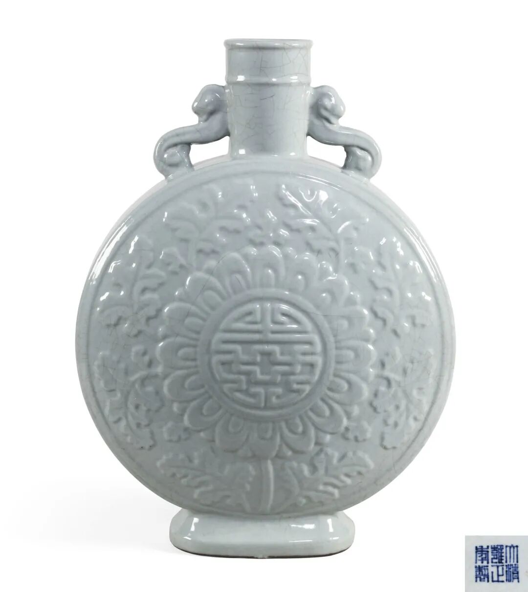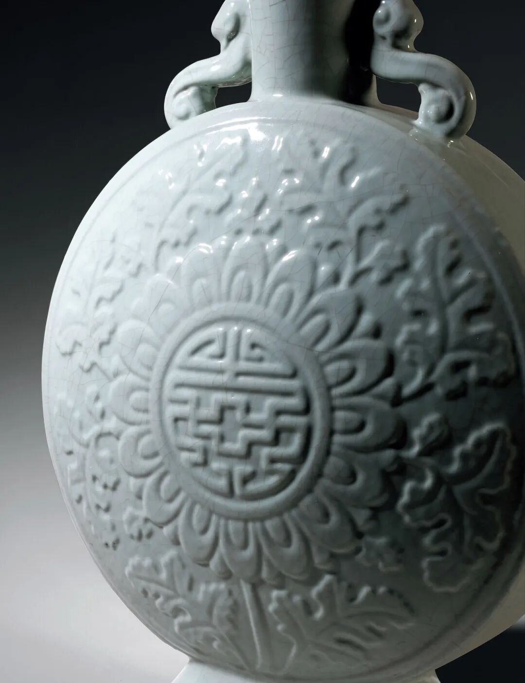 本品由永宣时期之青花扁壶化裁而成,造型恢弘雄伟,其所施仿官釉,厚润静穆,散漫开片自见赵宋遗韵。瓶唇口,直颈,扁圆腹,两侧卷云耳连接颈肩,下承长方形弧角圈足,足墙外撇。通体施仿官釉,肥润匀厚,如脂似玉,外壁以模印“团寿”、“菊瓣状”、“菊叶花”,错落参次,近似雕漆而胜似雕漆,足内青花书“大清雍正年制”六字三行篆书款。整体瓶体稳健,端庄硕大,加之模印之装饰,不独以一色取胜,可为雍正御窑之佳作。