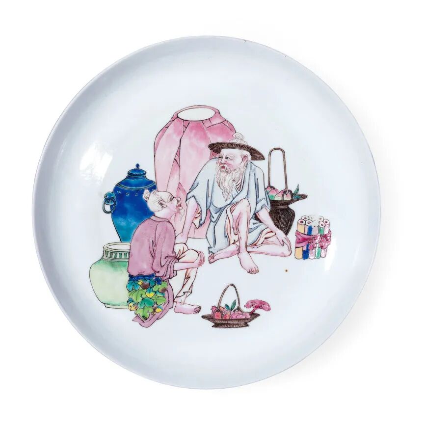 清雍正 外胭脂水釉内粉彩“渔樵问答”图盘